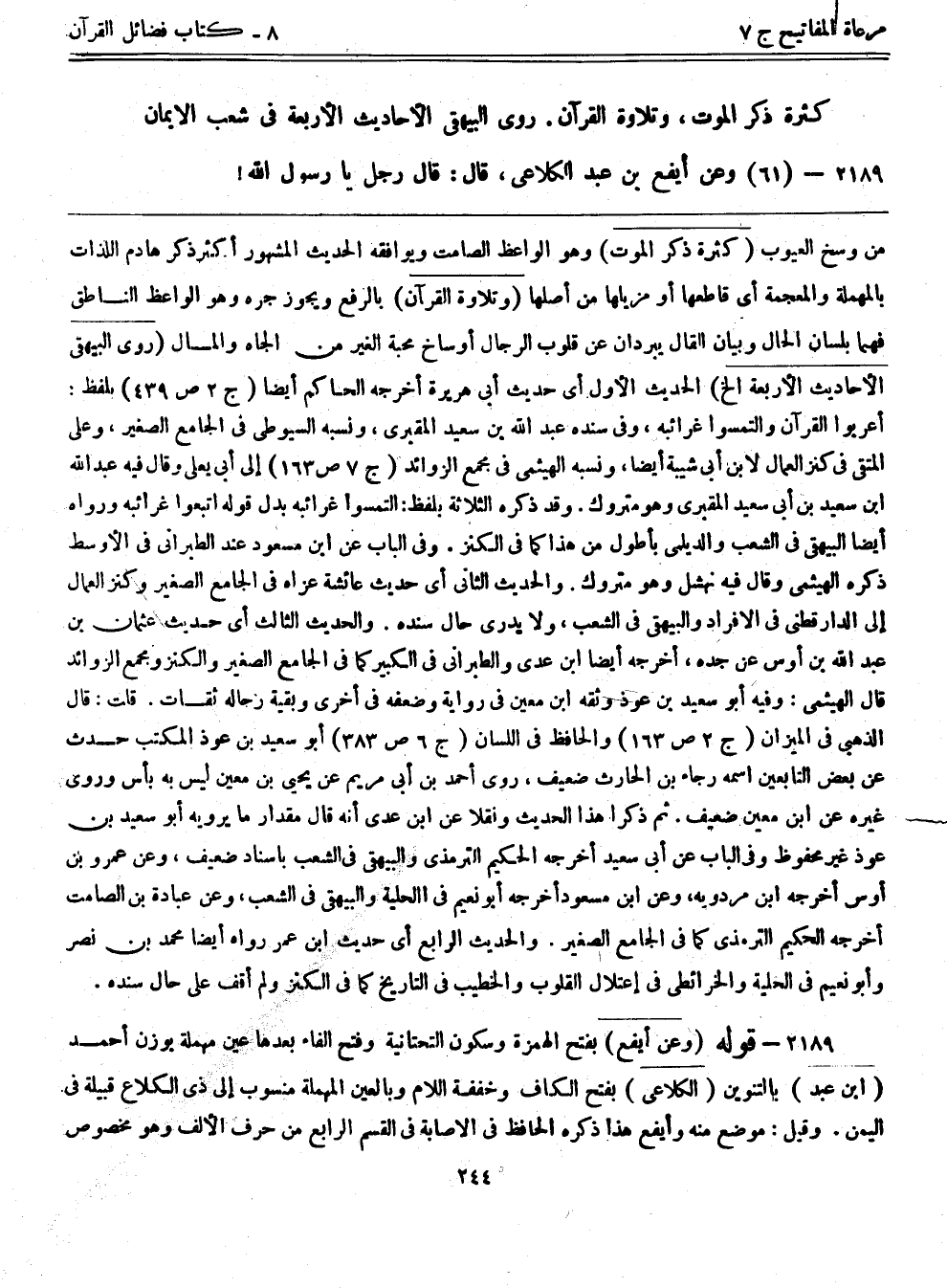 2189- قوله: (وعن أيفع) بفتح الهمزة وسكون التحتانية وفتح الفاء بعدها عين مهملة بوزن أحمد (ابن عبد) بالتنوين (الكلاعي) بفتح الكاف وخففة اللام وبالعين المهملة منسوب إلى ذي الكلاع قبيلة في اليمن. وقيل: موضع منه وأيفع هذا ذكره الحافظ في الإصابة في القسم الرابع من حرف الألف وهو مخصوص