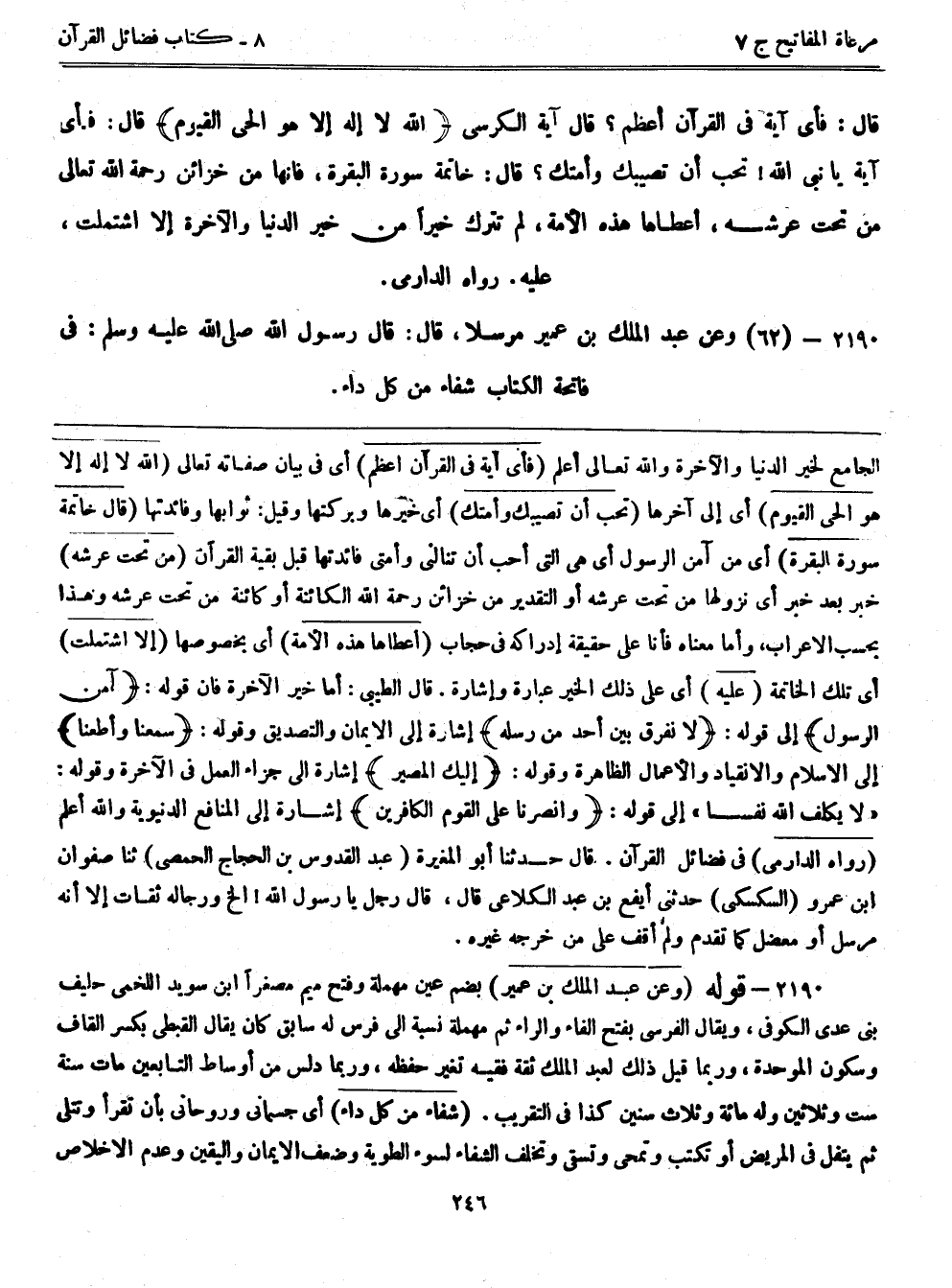 2190- قوله: (وعن عبد الملك بن عمير) بضم عين مهملة وفتح ميم مصغراً ابن سويد اللخمي حليف بني عدي الكوفي، ويقال الفرسي بفتح الفاء والراء ثم مهملة نسبة إلى فرس له سابق كان يقال القبطي بكسر القاف وسكون الموحدة، وربما قيل ذلك لعبد الملك ثقة فقيه تغير حفظه، وربما دلس من أوساط التابعين مات سنة ست وثلاثين وله مائة وثلاث سنين كذا في التقريب. (شفاء من كل داء) أي جسماني وروحاني بأن تقرأ وتتلى ثم يتفل في المريض أو تكتب وتمحي وتسقي وتخلف الشفاء لسوء الطوية وضعف الإيمان واليقين وعدم الإخلاص