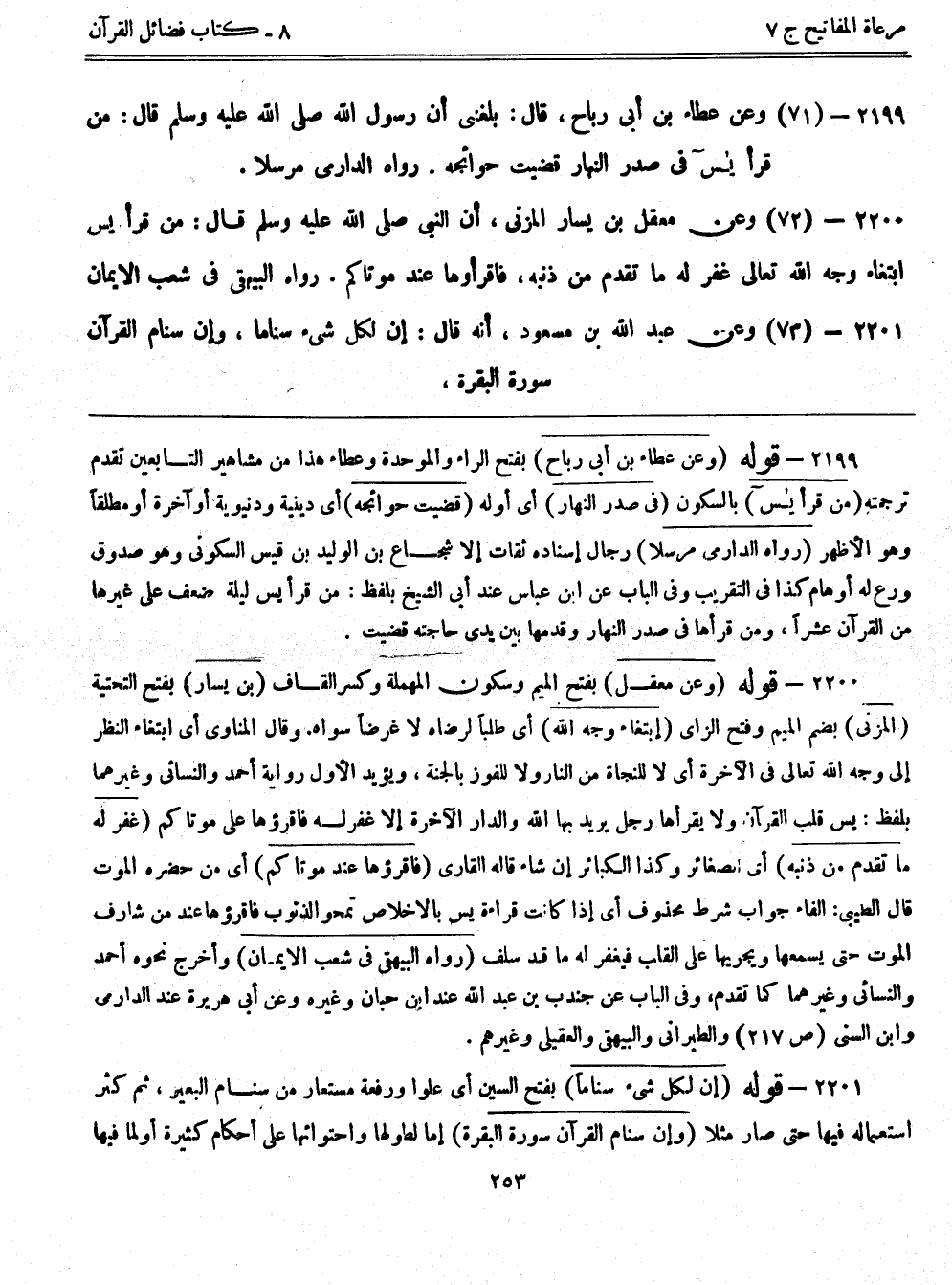 2200- قوله: (وعن معقل) بفتح الميم وسكون المهملة وكسر القاف (بن يسار) بفتح التحتية (المزني) بضم الميم وفتح الزاي (ابتغاء وجه الله) أي طلباً لرضاه لا غرضاً سواه. وقال المناوي أي ابتغاء النظر إلى وجه الله تعالى في الآخرة أي لا للنجاة من النار ولا للفوز بالجنة، ويؤيد الأول رواية أحمد والنسائي وغيرهما بلفظ: يس قلب القرآن ولا يقرأها رجل يريد بها الله والدار الآخرة إلا غفر له فاقرؤها على موتاكم (غفر له ما تقدم من ذنبه) أي الصغائر وكذا الكبائر إن شاء قاله القاري (فاقرؤها عند موتاكم) أي من حضره الموت قال الطيبي: الفاء جواب شرط محذوف أي إذا كانت قراءة يس بالإخلاص تمحو الذنوب فاقرؤها عند من شارف الموت حتى يسمعها ويجريها على القلب فيغفر له ما قد سلف (رواه البيهقي في شعب الإيمان) وأخرجه نحوه أحمد والنسائي وغيرهما كما تقدم، وفي الباب عن جندب بن عبد الله عند ابن حبان وغيره وعن أبي هريرة عند الدارمي وابن السني (ص217) والطبراني والبيهقي والعقيلي وغيرهم.