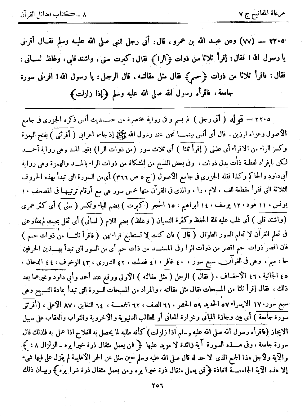 2205- (77) وعن عبد الله بن عمرو، قال: أتى رجل النبي صلى الله عليه وسلم فقال أقرؤني يا رسول الله! فقال: ((اقرأ ثلاثاً من ذوات (الرا) فقال: كبرت سني، واشتد قلبي، وغلظ لساني: فقال: فاقرأ ثلاثاً من ذوات (حم) فقال مثل مقالته، قال الرجل: يا رسول الله! اقرءني سورة جامعة، فاقرأه رسول الله صلى الله عليه وسلم {إذا زلزلت}