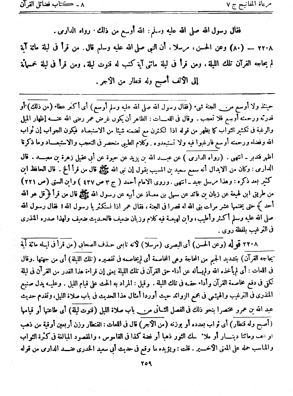 2208- قوله: (وعن الحسن) أي البصري (مرسلاً) لأنه تابعي حذف الصحابي (من قرأ في ليلة مائة آية يحاجه القرآن) بتشديد الجيم من المحاجة وهي المخاصمة أي لم يخاصمه في تقصيره (تلك الليلة) أي من جهتها. وقال في اللمعات: أي لم يأخذه الله ولم يسأله عن أداء حق القرآن في تلك الليلة يعني إن قراءة هذا القدر من القرآن في ليلة تكفي في دفع مخاصمة القرآن وأداء حقه في تلك الليلة. وقيل: المراد به الحث على قيام الليل. وعليه يدل صنيع المنذري في الترغيب والهيثمي في مجمع الزوائد حيث أوردا أمثال هذا الحديث في باب صلاة الليل وتقدم حديث عبد الله بن عمرو مختصراً بنحو ذلك في الفصل الثاني من باب صلاة الليل (قنوت ليلة) أي طاعتها أو قيامها (أصبح وله قنطار) أي ثواب بعدده أو بوزنه (من الأجر) قال في اللمعات: القنطار وزن أربعين أوقية من ذهب أو ألف ومائتا دينار أو ملأ مسك الثور ذهباً أو فضة كذا في القاموس، والمقصود المبالغة في كثرة الثواب والمناسب حمله على المعنى الأخير. قلت: ويؤيده ما وقع في حديث أبي سعيد الخدري عند الدارمي من قوله