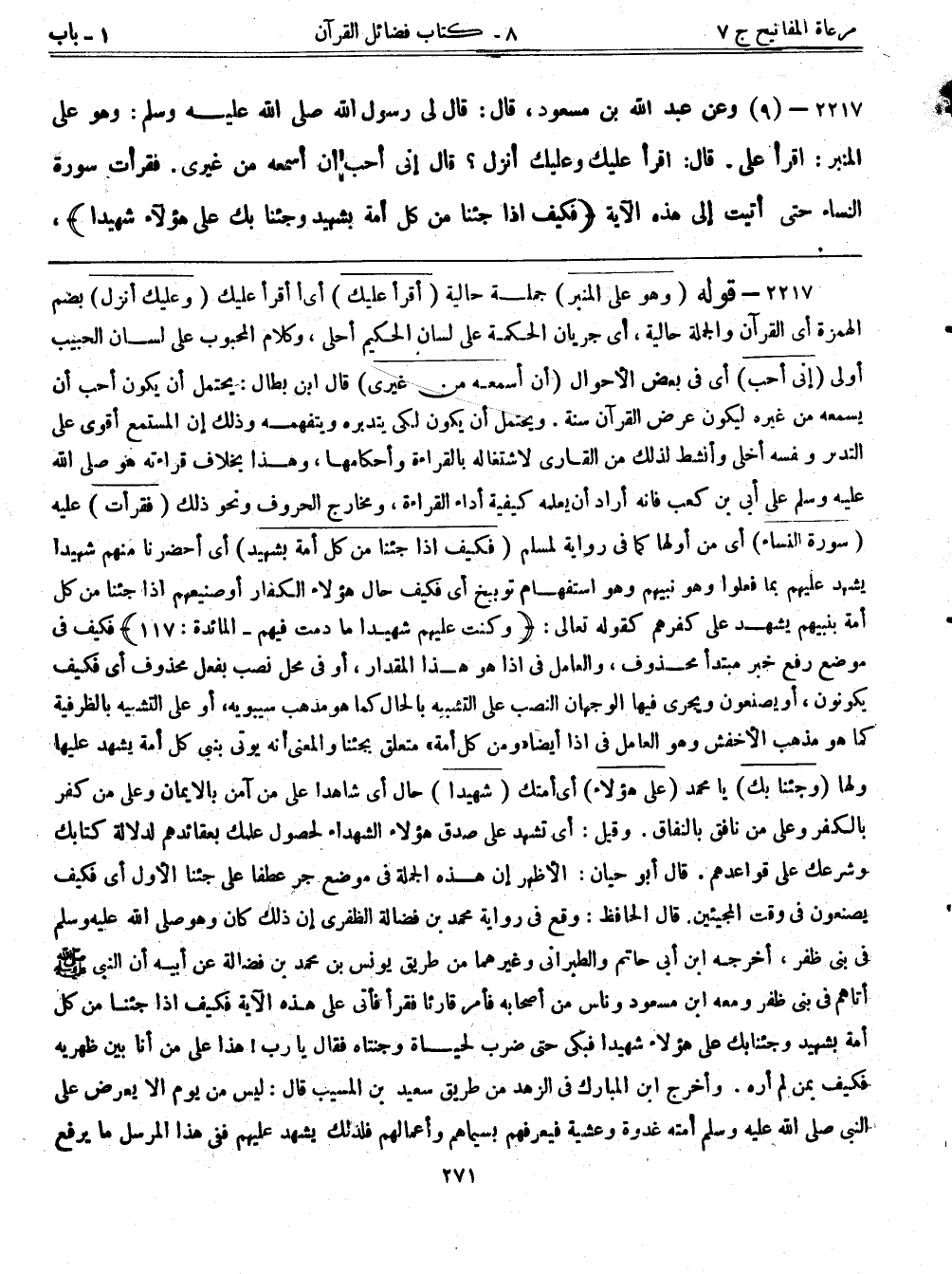 2217- (9) وعن عبد الله بن مسعود، قال: قال لي رسول الله صلى الله عليه وسلم، وهو على المنبر: ((اقرأ علي. قال: اقرأ عليك وعليك أنزل؟ قال إني أحب أن أسمعه من غيري. فقرأت النساء حتى أتيت إلى هذه الآية {فكيف إذا جئنا من كل أمة بشهيدٍ وجئنا بك على هؤلاء شهيداً}