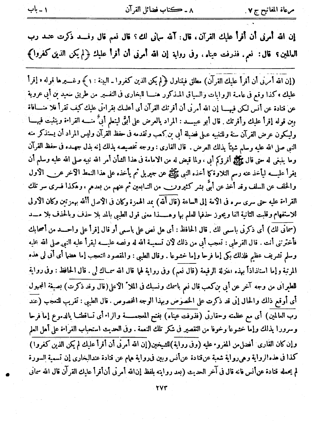 (إن الله أمرني أن أقرأ عليك القرآن) مطلق فيتناول {لم يكن الذين كفروا} [البينة: 1] وغيرها قوله "اقرأ عليك"كذا وقع في عامة الروايات والسياق المذكور هنا للبخاري في التفسير من طريق سعيد بن أبي عروبة عن قتادة عن أنس لكن فيها إن الله أمرني أن أقرئك القرآن أي أعلمك بقراءتي عليك كيف تقرأ فلا منافاة بين قوله إقرأ عليك وأقرئك. قال أبوعبيد: المراد بالعرض على أبٍّي ليتعلم أبيٌ منه القراءة ويتثبت فيها وليكون عرض القرآن سنة وللتنبيه على فضيلة أبي بن كعب وتقدمه في حفظ القرآن وليس المراد أن يستذكر منه النبي صلى الله عليه وسلم شيئاً بذلك العرض. قال القاري: ووجه تخصيصه بذلك إنه بذل جهده في حفظ القرآن وما ينبغي له حتى قال - صلى الله عليه وسلم - أقرؤكم أبي، ولما قيض له من الإمامة في هذا الشأن أمر الله نبيه صلى الله عليه وسلم أن يقرأ عليه ليأخذ عنه رسم التلاوة كما أخذه النبي - صلى الله عليه وسلم - عن جبريل ثم يأخذه على هذا النمط الآخر عن الأول والخلف عن السلف وقد أخذ عن أبٍّي بشر كثيرون من التابعين ثم عنهم من بعدهم، وهكذا فسرى سر تلك القراءة عليه حتى سرى سره في الأمة إلى الساعة (قال آلله) بمد الهمزة وكان في الأصل أألله بهمزتين وكان الأولى للإستفهام وقلبت الثانية الفاً ويجوز حذفها للعلم بها وهذا معنى قول الطيبي بالمد بلا حذف وبالحذف بلا مد (سماني لك) أي ذكرني باسمي لك. قال الحافظ: أي هل نص على باسمي أو قال إقرأ على واحد من أصحابك فأخترتني أنت. قال القرطبي: تعجب أبي من ذلك لأن تسمية الله له ونصه عليه ليقرأ عليه النبي صلى الله عليه وسلم تشريف عظيم فلذلك بكى إما فرحاً وإما خشوعاً. وقال الطيبي: والمقصود التعجب إما هضماً أي أنى لي هذه المرتبة وإما استلذاذاً بهذه المنزلة الرفيعة (قال نعم) وفي رواية لهما قال الله سماك لي. قال الحافظ: وفي رواية للطبراني من وجه آخر عن أبي بن كعب قال نعم باسمك ونسبك في الملأ الأعلى (قال وقد ذكرت) بصيغة المجهول أي أوقع ذلك والحال إني قد ذكرت على الخصوص وبهذا الوجه المخصوص. قال الطيبي: تقريب للتعجب (عند رب العالمين) أي مع عظمته وحقارتي (فذرفت عيناه) بفتح المعجمة والراء أي تساقطتا بالدموع إما فرحاً وسروراً بذلك وإما خشوعاً وخوفاً من التقصير في شكر تلك النعمة. وفي الحديث استحباب القراءة على أهل العلم وإن كان القاري أفضل من المقروء عليه (وفي رواية) للشيخين (إن الله أمرني أن أقرأ عليك لم يكن الذين كفروا) كذا في هذه الرواية وهي رواية شعبة عن قتادة عن أنس وبين في رواية همام عن قتادة عند البخاري إن تسمية السورة لم يحمله قتادة عن أنس فإنه قال في آخر الحديث (بعد روايته بلفظ إن الله أمرني أن أقرأ عليك القرآن قال الله سماني