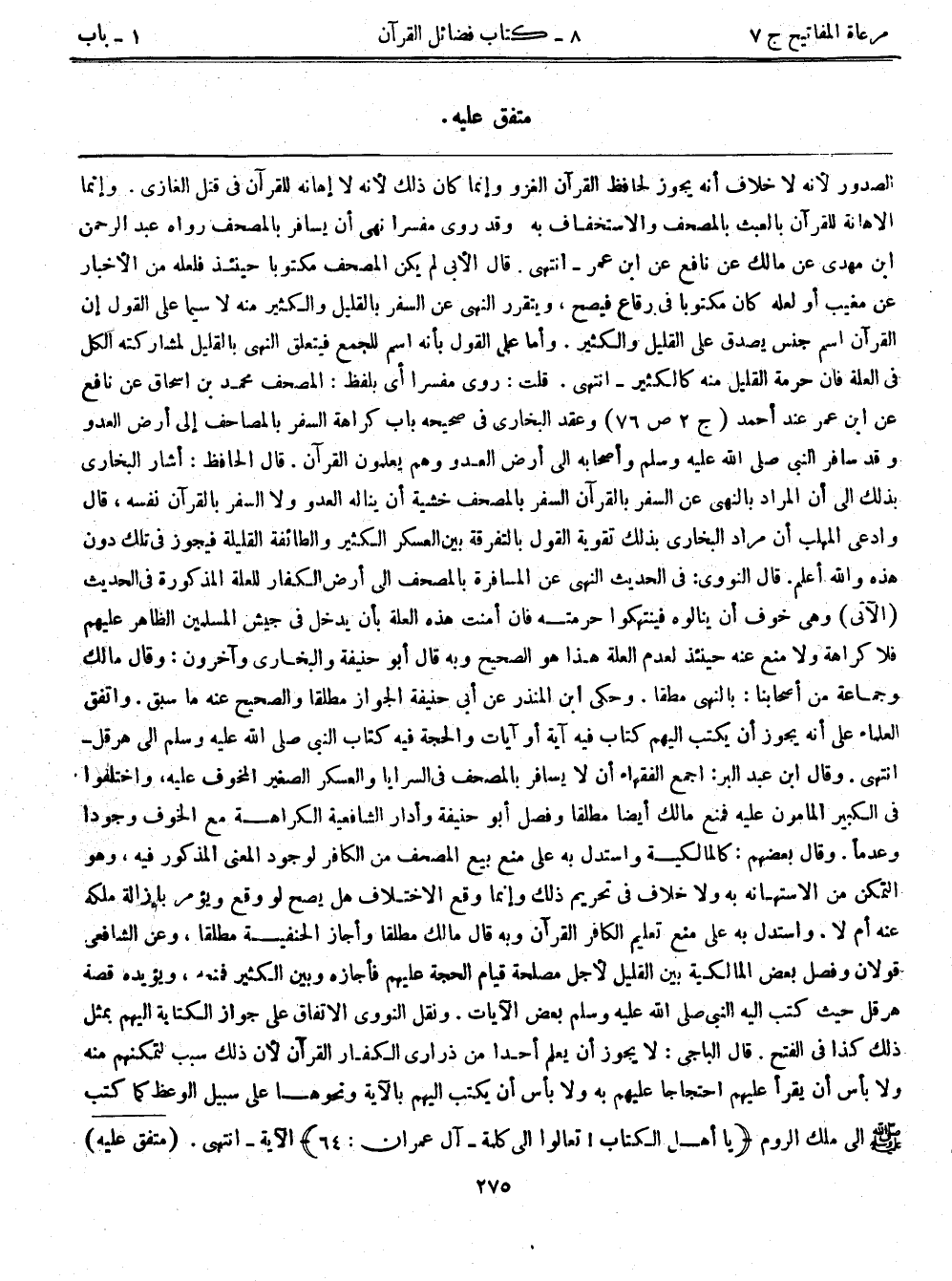 وإنما الإهانة للقرآن بالعبث بالمصحف والاستخفاف به وقد روى مفسراً نهى أن يسافر بالمصحف رواه عبد الرحمن ابن مهدي عن مالك عن نافع عن ابن عمر- انتهى. قال الأبي لم يكن المصحف مكتوباً حينئذٍ فلعله من الأخبار عن مغيب أو لعله كان مكتوباً في رقاع فيصح، ويتقرر النهي عن السفر بالقليل والكثير منه لا سيما على القول إن القرآن اسم جنس يصدق على القليل والكثير. وأما على القول بأنه اسم للجمع فيتعلق النهي بالقليل لمشاركته الكل في العلة فإن حرمة القليل منه كالكثير- انتهى. قلت: روى مفسراً أي بلفظ: المصحف محمد بن إسحاق عن نافع عن ابن عمر عند أحمد (ج2ص76) وعقد البخاري في صحيحه باب كراهة السفر بالمصاحف إلى أرض العدو وقد سافر النبي صلى الله عليه وسلم وأصحابه إلى أرض العدو وهم يعلمون القرآن. قال الحافظ: أشار البخاري بذلك إلى أن المراد بالنهي عن السفر بالقرآن السفر بالمصحف خشية أن يناله العدو ولا السفر بالقرآن نفسه، قال وادعى المهلب أن مراد البخاري بذلك تقوية القول بالتفرقة بين العسكر الكثير والطائفة القليلة فيجوز في تلك دون هذه والله أعلم. قال النووي: في الحديث النهي عن المسافرة بالمصحف إلى أرض الكفار للعلة المذكورة في الحديث (الآتي) وهي خوف أن ينالوه فينتهكوا حرمته فإن أمنت هذه العلة بأن يدخل في جيش المسلمين الظاهر عليهم فلا كراهة ولا منع عنه حينئذٍ لعدم العلة هذا هو الصحيح وبه قال أبوحنيفة والبخاري وآخرون: وقال مالك وجماعة من أصحابنا: بالنهي مطلقاً. وحكى ابن المنذر عن أبي حنيفة الجواز مطلقاً والصحيح عنه ما سبق. واتفق العلماء على أنه يجوز أن يكتب إليهم كتاب فيه آية أو آيات والحجة فيه كتاب النبي صلى الله عليه وسلم إلى هرقل- انتهى. وقال ابن عبد البر: اجمع الفقهاء أن لا يسافر بالمصحف في السرايا والعسكر الصغير المخوف عليه، واختلفوا في الكبير المأمون عليه فمنع مالك أيضاً مطلقاً وفصل أبوحنيفة وأدار الشافعية الكراهة مع الخوف وجوداً وعدماً. وقال بعضهم: كالمالكية واستدل به على منع بيع المصحف من الكافر لوجود المعنى المذكور فيه، وهو التمكن من الاستهانة به ولا خلاف في تحريم ذلك وإنما وقع الاختلاف هل يصح لو وقع ويؤمر بإزالة ملكه عنه أم لا. واستدل به على منع تعليم الكافر القرآن وبه قال مالك مطلقاً وأجاز الحنفية مطلقاً، وعن الشافعي قولان وفصل بعض المالكية بين القليل لأجل مصلحة قيام الحجة عليهم فأجازه وبين الكثير فمنعه، ويؤيده قصة هرقل حيث كتب إليه النبي صلى الله عليه وسلم بعض الآيات. ونقل النووي الاتفاق على جواز الكتابة إليهم بمثل ذلك كذا في الفتح. قال الباجي: لا يجوز أن يعلم أحداً من ذراري الكفار القرآن لأن ذلك سبب لتمكنهم منه ولا بأس أن يقرأ عليهم احتجاجاً عليهم به ولا بأس أن يكتب إليهم بالآية ونحوها على سبيل الوعظ كما كتب - صلى الله عليه وسلم - إلى ملك الروم {يا أهل الكتاب! تعالوا إلى كلمة} الآية [آل عمران: 64]- انتهى. (متفق عليه)