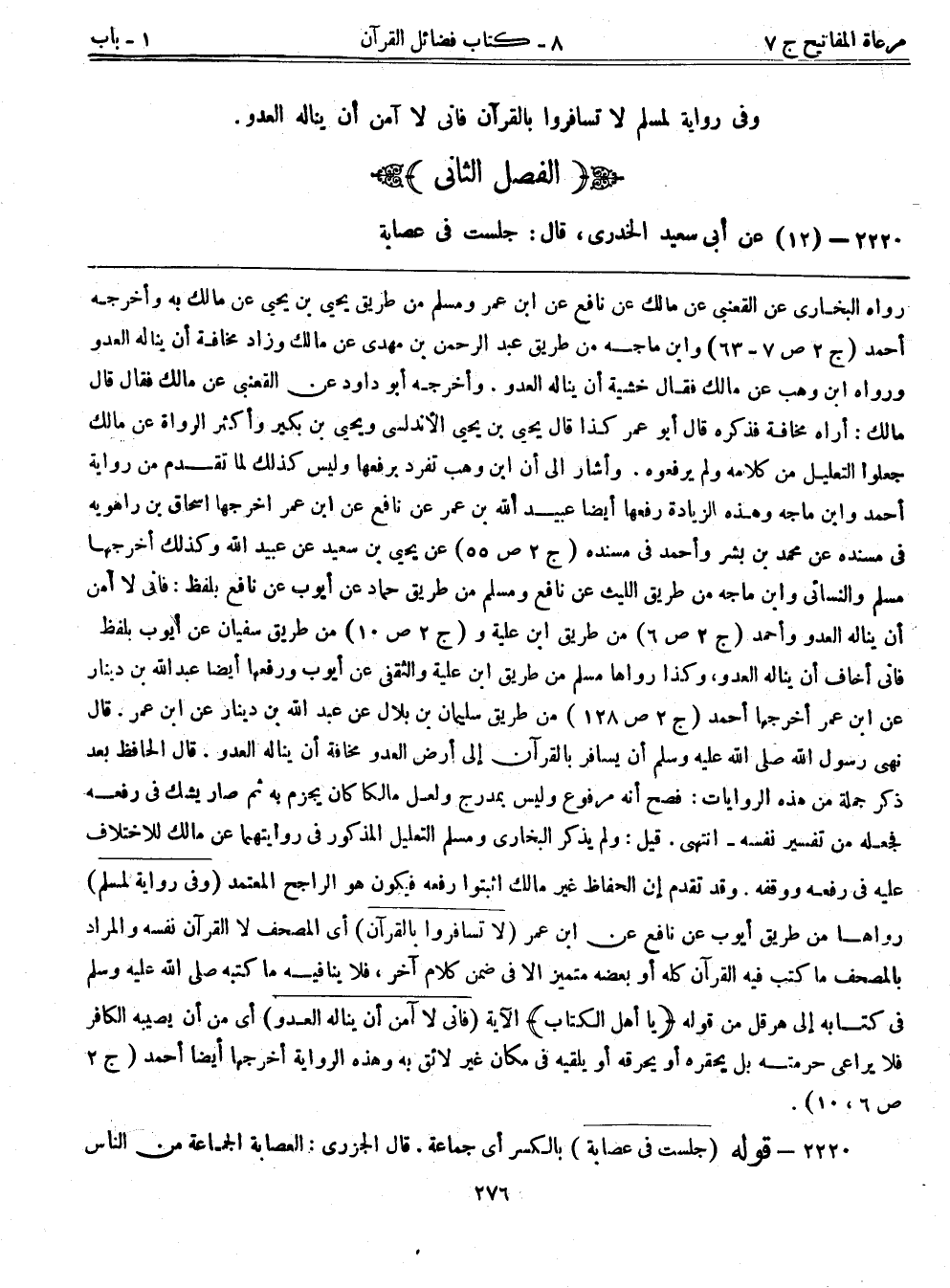 رواه البخاري عن القعنبي عن مالك عن نافع عن ابن عمر ومسلم من طريق يحيى بن يحيى عن مالك به وأخرجه أحمد (ج2ص7- 63) وابن ماجه من طريق عبد الرحمن بن مهدي عن مالك وزاد مخافة أن يناله العدو ورواه ابن وهب عن مالك فقال: خشية أن يناله العدو. وأخرجه أبوداود عن القعنبي عن مالك فقال قال مالك: أراه مخافة فذكره قال أبوعمر كذا قال يحيى بن يحيى الأندلسي ويحيي بن بكير وأكثر الرواة عن مالك جعلوا التعليل من كلامه ولم يرفعوه. وأشار إلى أن ابن وهب تفرد برفعها وليس كذلك لما تقدم من رواية أحمد وابن ماجه وهذه الزيادة رفعها أيضاً عبيد الله بن عمر عن نافع عن ابن عمر أخرجها إسحاق بن راهوية في مسنده عن محمد بن بشر وأحمد في مسنده (ج2ص55) عن يحيى بن سعيد عن عبيد الله وكذلك أخرجها مسلم والنسائي وابن ماجه من طريق الليث عن نافع ومسلم من طريق حماد عن أيوب عن نافع بلفظ: فإني لا آمن أن يناله العدو وأحمد (ج2ص6) من طريق ابن علية و (ج2ص10) من طريق سفيان عن أيوب بلفظ فإني أخاف أن يناله العدو، وكذا رواها مسلم من طريق ابن علية والثقفي عن أيوب ورفعها أيضاً عبد الله بن دينار عن ابن عمر أخرجها أحمد (ج2ص128) من طريق سليمان بن بلال عن عبد الله بن دينار عن ابن عمر قال: نهى رسول الله صلى الله عليه وسلم أن يسافر بالقرآن إلى أرض العدو مخافة أن يناله العدو. قال الحافظ بعد ذكر جملة من هذه الروايات: فصح أنه مرفوع وليس بمدرج ولعل مالكاً كان يجزم به ثم صار يشك في رفعه فجعله من تفسير نفسه- انتهى. قيل: ولم يذكر البخاري ومسلم التعليل المذكور في روايتهما عن مالك للاختلاف عليه في رفعه ووقفه. وقد تقدم إن الحفاظ غير مالك اثبتوا رفعه فيكون هو الراجح المعتمد (وفي رواية لمسلم) رواها من طريق أيوب عن نافع عن ابن عمر (لا تسافروا بالقرآن) أي المصحف لا القرآن نفسه والمراد بالمصحف ما كتب فيه القرآن كله أو بعضه متميز إلا في ضمن كلام آخر، فلا ينافيه ما كتبه صلى الله عليه وسلم في كتابه إلى هرقل من قوله (يا أهل الكتاب) الآية (فإني لا آمن أن يناله العدو) أي من أن يصيبه الكافر فلا يراعي حرمته بل يحقره أو يحرقه أو يلقيه في مكان غير لائق به وهذه الرواية أخرجها أيضاً أحمد (ج2ص6، 10) .