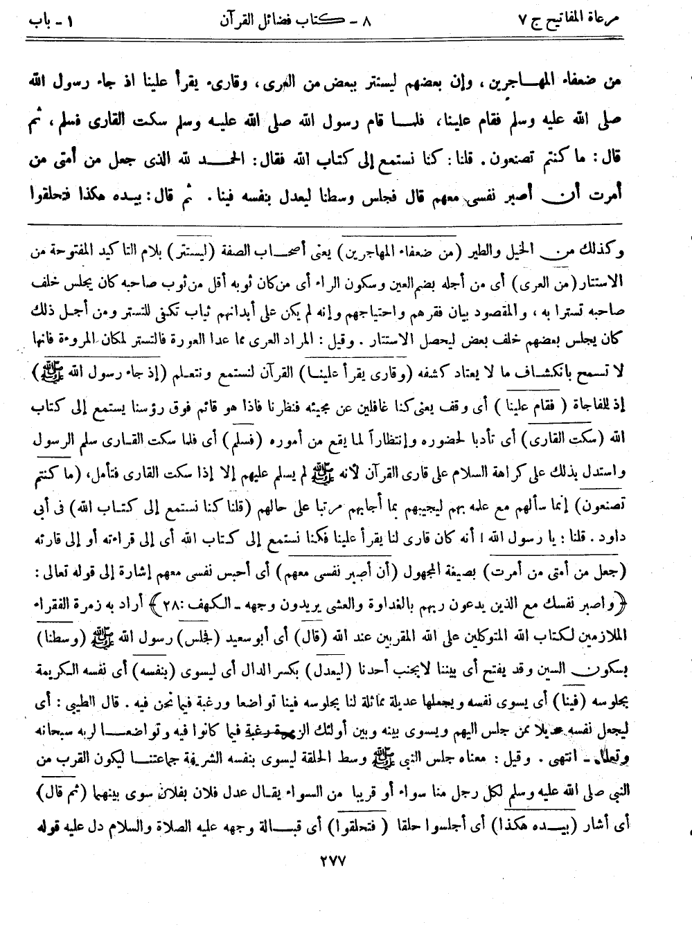 من ضعفاء المهاجرين، وإن بعضهم ليستتر ببعض من العرى، وقاري يقرأ علينا إذ جاء رسول الله صلى الله عليه وسلم فقام علينا، فلما قام رسول الله صلى الله عليه وسلم سكت القاري فسلم، ثم قال: ما كنتم تصنعون. قلنا: كنا نستمع إلى كتاب الله فقال: الحمد لله الذي جعل من أمتي من أمرت أن أصبر نفسي معهم قال فجلس وسطنا ليعدل بنفسه فينا. ثم قال: بيده هكذا فتحلقوا