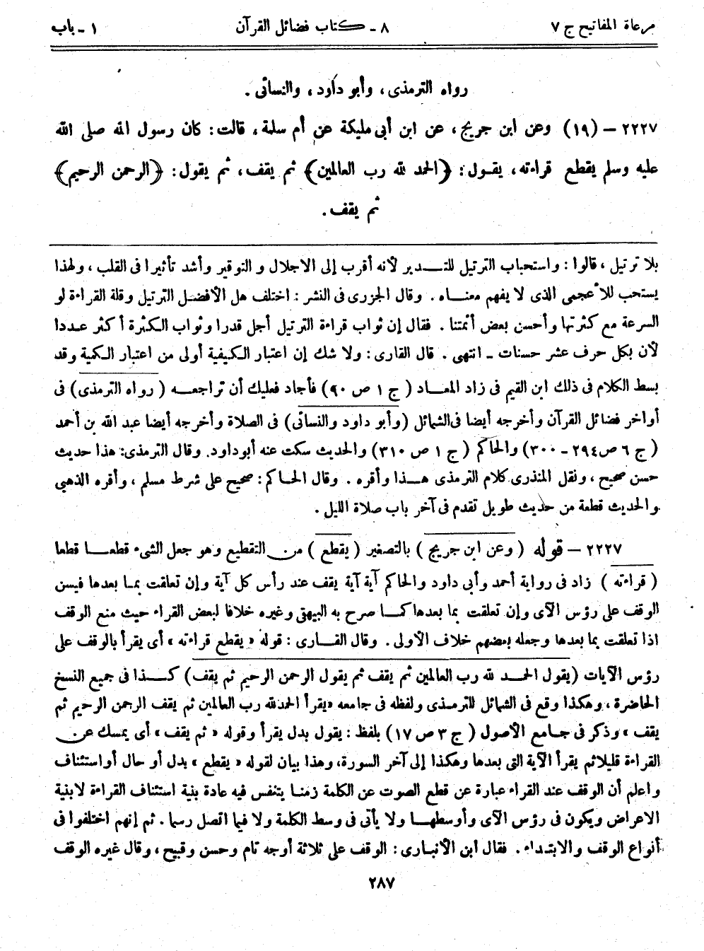 بلا ترتيل، قالوا: واستحباب الترتيل للتدبر لأنه أقرب إلى الإجلال والتوقير وأشد تأثيراً في القلب، ولهذا يستحب للأعجمي الذي لا يفهم معناه. وقال الجزري في النشر: اختلف هل الأفضل الترتيل وقلة القراءة لو السرعة مع كثرتها وأحسن بعض أئمتنا. فقال إن ثواب قراءة الترتيل أجل قدراً وثواب الكثرة أكثر عدداً لأن بكل حرف عشر حسنات- انتهى. قال القاري: ولا شك إن اعتبار الكيفية أولى من اعتبار الكمية وقد بسط الكلام في ذلك ابن القيم في زاد المعاد (ج1ص90) فأجاد فعليك أن تراجعه (رواه الترمذي) في أواخر فضائل القرآن وأخرجه أيضاً في الشمائل (وأبو داود والنسائي) في الصلاة وأخرجه أيضاً عبد الله بن أحمد (ج6ص294-300) والحاكم (ج1ص310) والحديث سكت عنه أبوداود. وقال الترمذي: هذا حديث حسن صحيح، ونقل المنذري كلام الترمذي هذا وأقره. وقال الحاكم: صحيح على شرط مسلم، وأقره الذهبي والحديث قطعة من حديث طويل تقدم في آخر باب صلاة الليل.