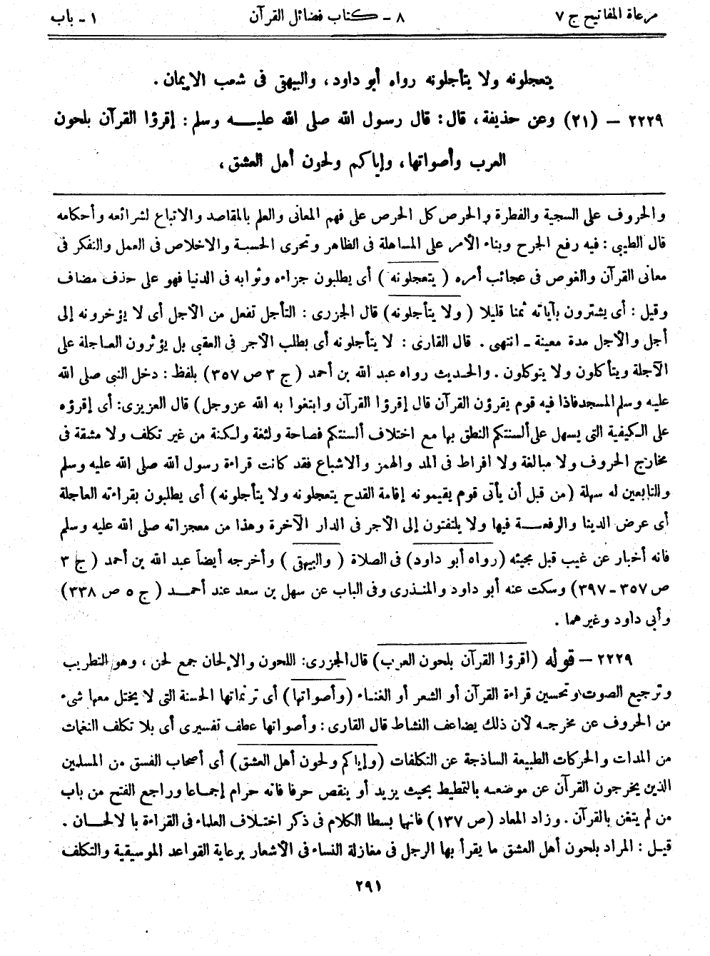 2229- (21) وعن حذيفة، قال: قال رسول الله صلى الله عليه وسلم: ((إقرؤا القرآن بلحون العرب وأصواتها، وإياكم ولحون أهل العشق،