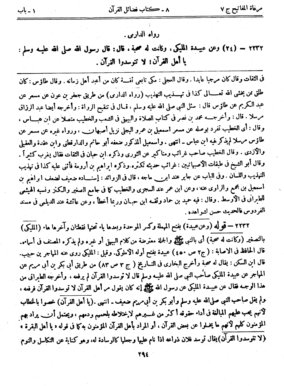 2232- (24) وعن عبيدة المليكي، وكانت له صحبة، قال: قال رسول الله صلى الله عليه وسلم: ((يا أهل القرآن! لا تتوسدوا القرآن)) .