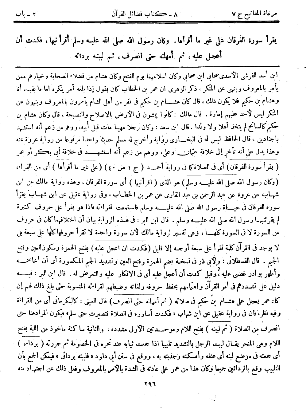 ابن أسد القرشي الأسدي صحابي ابن صحابي وكان إسلامهما يوم الفتح وكان هشام من فضلاء الصحابة وخيارهم ممن يأمر بالمعروف وينهى عن المنكر، ذكر الزهري أن عمر بن الخطاب كان يقول إذا بلغه أمر ينكره أما ما بقيت أنا وهشام بن حكيم فلا يكون ذلك، قال كان هشام بن حكيم في نفر من أهل الشام يأمرون بالمعروف وينهون عن المنكر ليس لأحد عليهم إمارة. قال مالك: كانوا يمشون في الأرض بالإصلاح والنصيحة، قال وكان هشام بن حكيم كالسائح لم يتخذ أهلاً ولا ولداً. قال ابن سعد: وكان رجلاً مهيباً مات قبل أبيه، ووهم من زعم أنه استشهد باجنادين. قال الحافظ ليس له في البخاري رواية وأخرج له مسلم حديثاً واحداً مرفوعاً من رواية عروة عنه وهذا يدل على أنه تأخر إلى خلافة عثمان وعلي، ووهم من زعم أنه استشهد في خلافة أبي بكر أو عمر (يقرأ سورة الفرقان) أي في الصلاة كما في رواية أحمد (ج1ص40) (على غير ما أقرأها) أي من القراءة (وكان رسول الله صلى الله عليه وسلم) هو الذي (أقرأنيها) أي سورة الفرقان، وهذه رواية مالك عن ابن شهاب عن عروة عن عبد الرحمن بن عبد القاري عن عمر بن الخطاب، وفي رواية عقيل عن ابن شهاب يقرأ سورة الفرقان في حياة رسول الله صلى الله عليه وسلم فاستمعت لقراءته فإذا هو يقرأ على حروف كثيرة لم يقرئنيها رسول الله صلى الله عليه وسلم. قال ابن البر: في هذه الرواية بيان أن اختلافهما كان في حروف من السورة لا في السورة كلها، وهي تفسير لرواية مالك لأن سورة واحدة لا تقرأ حروفها كلها على سبعة بل لا يوجد في القرآن كلمة تقرأ على سبعة أوجه إلا قليل (فكدت أن أعجل عليه) بفتح الهمزة وسكون العين وفتح الجيم. قال القسطلاني: ولأبي ذر في نسخة بضم الهمزة وفتح العين وتشديد الجيم المكسورة أي أن أخاصمه وأظهر بوادر غضبي عليه، وقيل كدت أن أعجل عليه أي في الإنكار عليه والتعرض له. قال ابن البر: فيه دليل على تشددهم في أمر القرآن واهتمامهم بحفظ حروفه ولغاته وضبطهم لقراءته المنسوبة حتى بلغ ذلك لهم إن كاد عمر يعجل على هشام بن حكيم في صلاته (ثم أمهلته حتى انصرف) قال العيني: كالكرماني أي من القراءة وفيه نظر، فإن في رواية عقيل عن ابن شهاب "فكدت أساوره في الصلاة فتصبرت حتى سلم" فيكون المراد هنا حتى انصرف من الصلاة (ثم لببته) بفتح اللام وموحدتين الأولى مشددة، والثانية ساكنة مأخوذ من اللبة بفتح اللام وهي المنحر يقال لببت الرجل بالتشديد تلبيباً إذا جمعت ثيابه عند نحره في الخصومة ثم جررته (برداءه) أي جمعته في موضع لبته أي عنقه وأمسكته وجذبته به، ووقع في سنن أبي داود "فلببته بردائي" فيمكن الجمع بأن التلبيب وقع بالردائين جميعاً وكان هذا من عمر على عادته في الشدة بالأمر بالمعروف وفعل ذلك عن اجتهاد منه