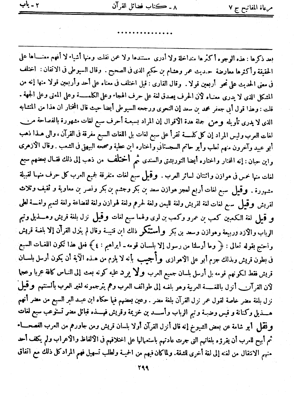 بعد ذكرها: هذه الوجوه أكثرها متداخلة ولا أدري مستندها ولا عمن نقلت ومنها أشياء لا أفهم معناها على الحقيقة وأكثرها معارضة حديث عمر وهشام بن حكيم الذي في الصحيح. وقال السيوطي في الإتقان: اختلف في معنى الحديث على نحو أربعين قولاً. وقال القاري: قيل اختلف في معناه على أحد وأربعين قولاً منها إنه من المشكل الذي لا يدري معناه لأن الحرف يصدق لغة على حرف الهجاء وعلى الكلمة وعلى المعنى وعلى الجهة. قلت: وهذا قول أبي جعفر محمد بن سعد إن النحوي ورجحه السيوطي أيضاً حيث قال المختار إن هذا من المتشابه الذي لا يدري تأويله ومن جملة هذه الأقوال إن المراد بسبعة أحرف سبع لغات مشهورة بالفصاحة من لغات العرب وليس المراد إن كل كلمة تقرأ على سبع لغات بل اللغات السبع مفرقة في القرآن، وإلى هذا ذهب أبوعبيد وآخرون منهم ثعلب وأبوحاتم السجستاني واختاره ابن عطية وصححه البيهقي في الشعب. وقال الأزهري وابن حبان: إنه المختار واختاره أيضاً التوربشتي والسندي ثم اختلف من ذهب إلى ذلك فقال بعضهم سبع لغات منها خمس في هوازن واثنتان لسائر العرب. وقيل سبع لغات متفرقة لجميع العرب كل حرف منها لقبيلة مشهورة. وقيل سبع لغات أربع لعجز هوازن سعد بن بكر وجشم بن بكر ونصر بن معاوية وثقيف وثلاث لقريش وقيل سبع لغات لغة لقريش ولغة لليمن ولغة لحرهم ولغة لهوازن ولغة لقضاعة ولغة لتميم ولغة لطي وقيل لغة الكعبين كعب بن عمرو وكعب بن لوي ولهما سبع لغات وقيل نزل بلغة قريش وهذيل وتيم الرباب والأزد وربيعة وهوازن وسعد بن بكر واستنكر ذلك ابن قتيبة وقال لم ينزل القرآن إلا بلغة قريش واحتج بقوله تعالى: {وما أرسلنا من رسول إلا بلسان قومه} [إبراهيم: 4] فعلى هذا تكون اللغات السبع في بطون قريش وبذلك جزم أبوعلي الأهوازي وأجيب بأنه لا يلزم من هذه الآية أن يكون أرسل بلسان قريش فقط لكونهم قومه بل أرسل بلسان جميع العرب ولا يرد عليه كونه بعث إلى الناس كافة عرباً وعجماً لأن القرآن أنزل باللغة العربية وهو بلغه إلى طوائف العرب وهم يترجمونه لغير العرب بألسنتهم وقيل نزل بلغة مضر خاصة لقول عمر نزل القرآن بلغة مضر. وعين بعضهم فيما حكاه ابن عبد البر السبع من مضر أنهم هذيل وكنانة وقيس وضبة وتيم الرباب وأسد بن خزيمة وقريش فهذه قبائل مضر تستوعب سبع لغات ونقل أبوشامة عن بعض الشيوخ إنه قال أنزل القرآن أولاً بلسان قريش ومن جاورهم من العرب الفصحاء ثم أبيح للعرب أن يقرؤه بلغاتهم التي جرت عادتهم باستعمالها على اختلافهم في الألفاظ والأعراب ولم يكلف أحد منهم الانتقال من لغته إلى لغة أخرى للمشقة. ولما كان فيهم من الحمية ولطلب تسهيل فهم المراد كل ذلك مع اتفاق