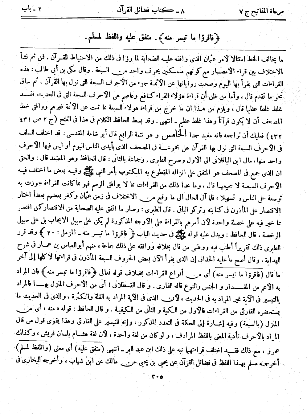 ما يخالف الخط امتثالاً لأمر عثمان الذي وافقه عليه الصحابة لما رأو في ذلك من الاحتياط للقرآن. فمن ثم نشأ الاختلاف بين قراء الأمصار مع كونهم متمسكين بحرف واحد من السبعة. وقال مكي بن أبي طالب: هذه القراءات التي يقرأ بها اليوم وصحت رواياتها عن الأئمة جزء من الأحرف السبعة التي نزل بها القرآن، ثم ساق نحو ما تقدم قال، وأما من ظن أن قراءة هؤلاء القراء كنافع وعاصم هي الأحرف السبعة التي في الحديث فقد غلط غلطاً عظيماً قال، ويلزم من هذا إن ما خرج من قراءة هؤلاء السبعة مما ثبت عن الأئمة غيرهم ووافق خط المصحف أن لا يكون قرآناً وهذا غلط عظيم- انتهى. وقد بسط الحافظ الكلام في هذا في الفتح (ج2ص431، 432) فعليك أن تراجعه فإنه مفيد جداً الخامس وهو تتمة الرابع قال أبوشامة المقدسي: قد اختلف السلف في الأحرف السبعة التي نزل بها القرآن هل مجموعة في المصحف الذي بأيدي الناس اليوم أو ليس فيها الأحرف واحد منها، مال ابن الباقلاني إلى الأول وصرح الطبري، وجماعة بالثاني: قال الحافظ وهو المعتمد قال: والحق أن الذي جمع في المصحف هو المتفق على إنزاله المقطوع به المكتوب بأمر النبي - صلى الله عليه وسلم - وفيه بعض ما اختلف فيه الأحرف السبعة لا جميعها قال، وما عدا ذلك من القراءات مما لا يوافق الرسم فهو مما كانت القراءة جوزت به توسعه على الناس وتسهيلاً، فلما آل الحال إلى ما وقع من الاختلاف في زمن عثمان وكفر بعضهم بعضاً اختار الاقتصار على المأذون في كتابته وتركوا الباقي. قال الطبري: وصار ما اتفق عليه الصحابة من الاقتصار كمن اقتصر مما خير فيه على خصلة واحدة لأن أمرهم بالقراءة على الأوجه المذكورة لم يكن على سبيل الإيجاب بل على سبيل الرخصة، قال الحافظ: ويدل عليه قوله - صلى الله عليه وسلم - في حديث الباب {فاقرؤا ما تيسر منه} [المزمل: 20] وقد قرر الطبري ذلك تقريراً أطنب فيه ووهّى من قال بخلافه ووافقه على ذلك جماعة، منهم أبوالعباس بن عمار في شرح الهداية، وقال أصح ما عليه الحذاق إن الذي يقرأ الآن بعض الحروف السبعة المأذون في قراءتها لا كلها إلى آخر ما قال (فاقرؤا ما تيسر منه) أي من أنواع القراءات بخلاف قوله تعالى {فاقرؤا ما تيسر منه} فإن المراد به الأعم من المقدار والجنس والنوع قاله القاري. وقال القسطلاني: أي من الأحرف المنزل بها فالمراد بالتيسير في الآية غير المراد به في الحديث، لأن الذي في الآية المراد به القلة والكثرة، والذي في الحديث ما يستحضره القاري من القراءات فالأول من الكمية والثاني من الكيفية. وقال الحافظ: قوله" منه" أي من المنزل (بالسبعة) وفيه إشارة إلى الحكمة في التعدد المذكور، وإنه للتيسير على القاري وهذا يقوى قول من قال المراد بالأحرف تأدية المعنى باللفظ المرادف، ولو كان من لغة واحدة، لأن لغة هشام بلسان قريش، وكذلك عمرو، مع ذلك فقد اختلف قراءتهما نبه على ذلك ابن عبد البر- انتهى (متفق عليه) أي معنى (واللفظ لمسلم) أخرجه مسلم بهذا اللفظ في فضائل القرآن عن يحيى بن يحيى عن مالك عن ابن شهاب، وأخرجه البخاري في