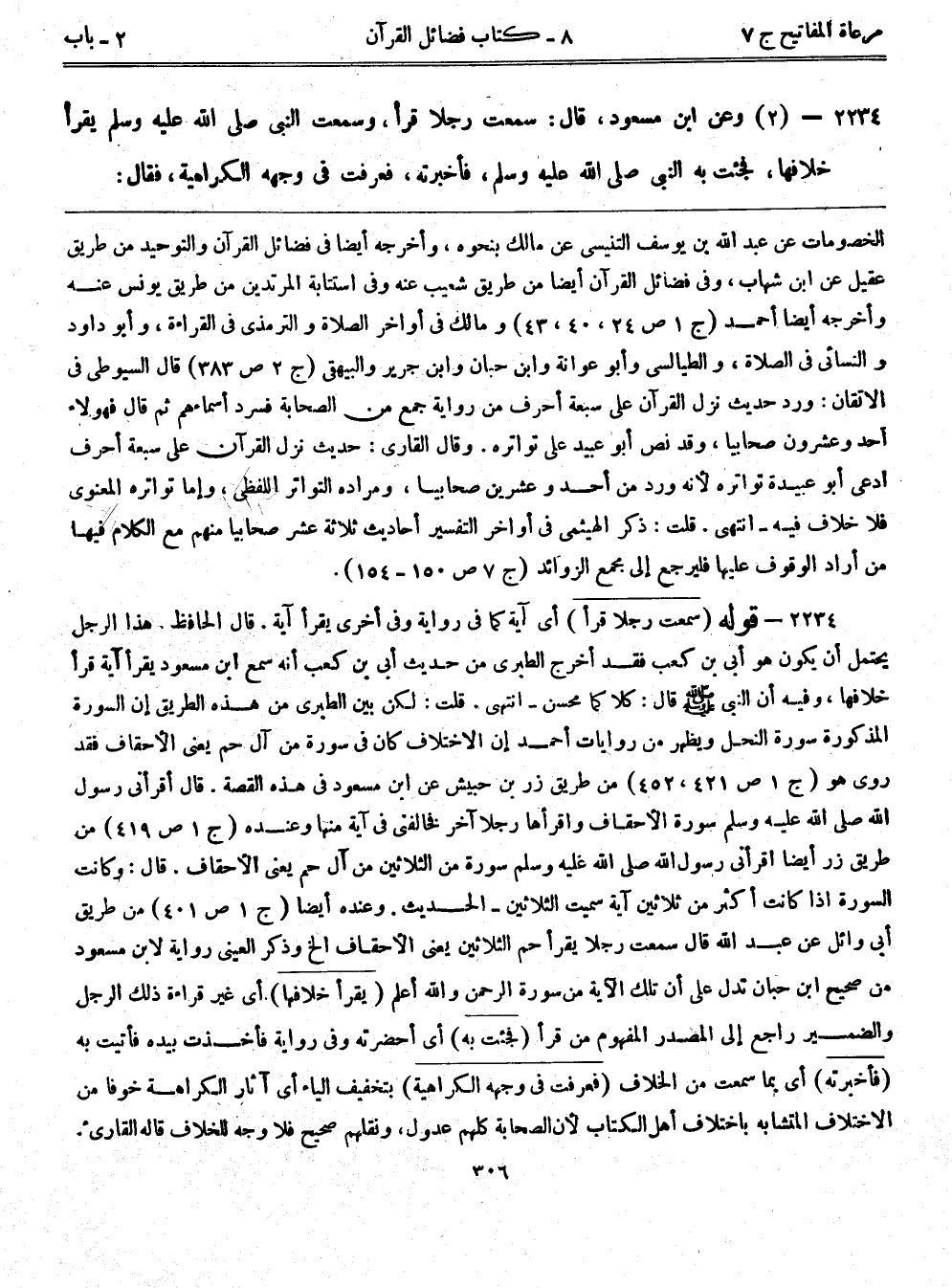 2234- (2) وعن ابن مسعود، قال: سمعت رجلاً قرأ، وسمعت النبي صلى الله عليه وسلم يقرأ خلافها، فجئت به النبي صلى الله عليه وسلم، فأخبرته، فعرفت في وجهه الكراهية، فقال: