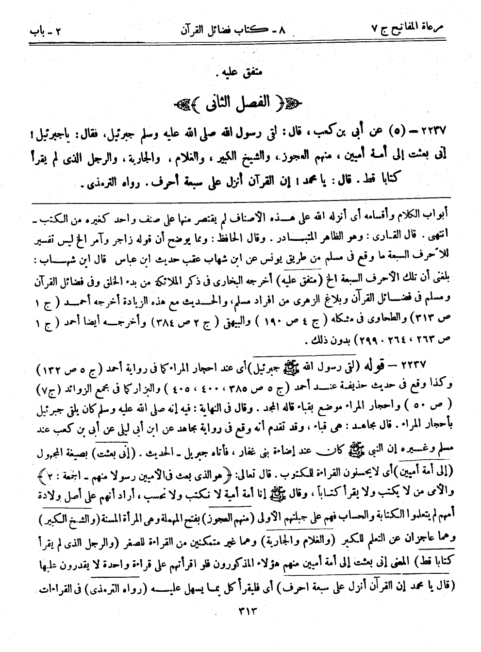 2237- (5) عن أبي بن كعب، قال: لقي رسول الله صلى الله عليه وسلم جبرئيل، فقال: ((يا جبرئيل! إني بعثت إلى أمة أميين، منهم العجوز، والشيخ الكبير، والغلام، والجارية، والرجل الذي لم يقرأ كتاباً قط. قال: يا محمد! إن القرآن أنزل على سبعة أحرف)) . رواه الترمذي.