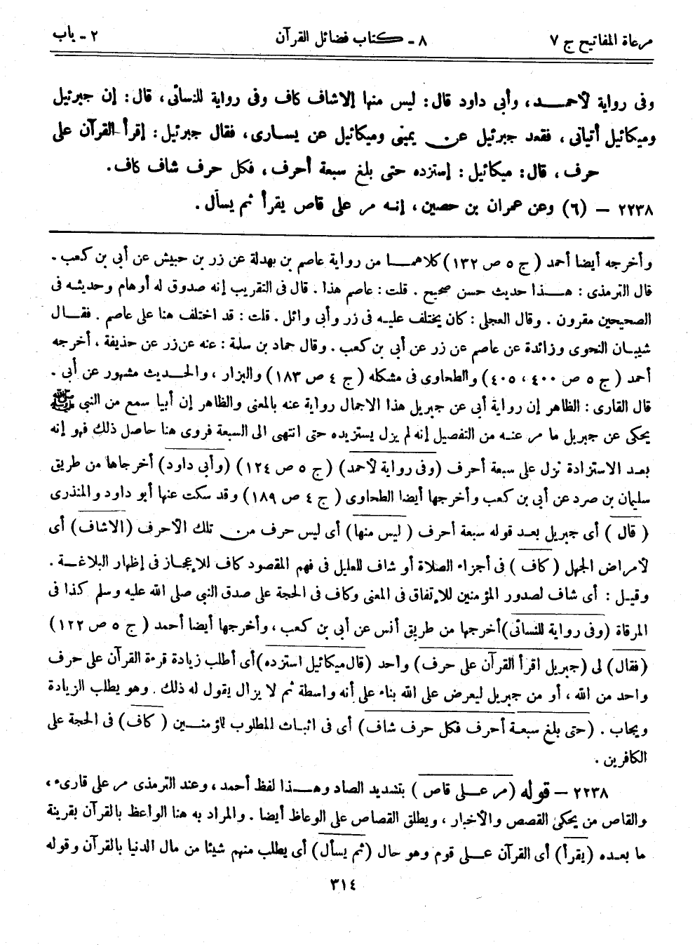 وفي رواية لأحمد، وأبي داود قال: ليس منها إلا شاف كاف وفي رواية للنسائي، قال: إن جبرئيل وميكائيل أتياني، فقعد جبرئيل عن يميني وميكائيل عن يساري، فقال جبرئيل: اقرأ القرآن على حرف، قال ميكائيل: استزده حتى بلغ سبعة أحرف، فكل حرف شاف كاف.