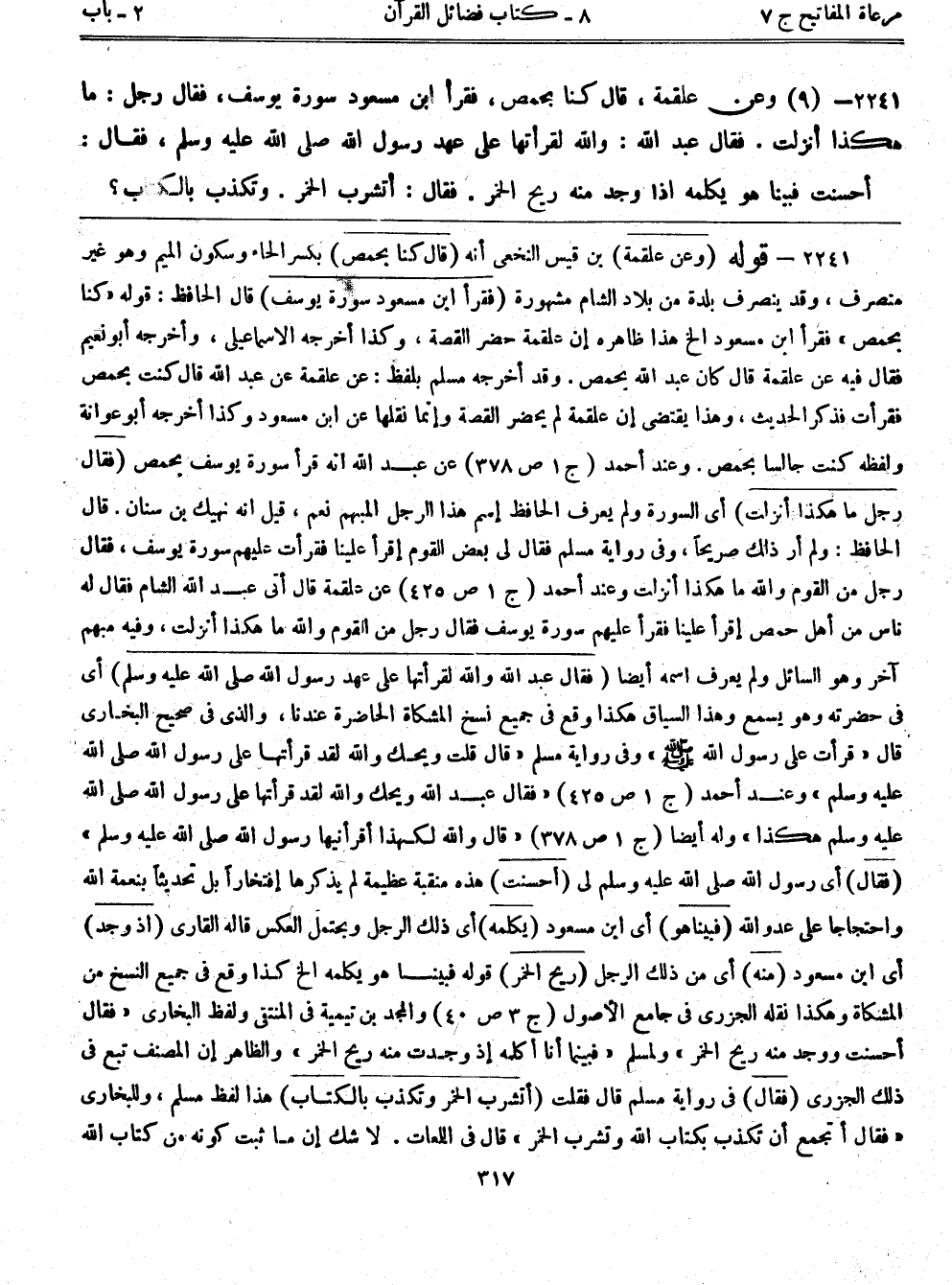 2241- (9) وعن علقمة، قال كنا بحمص، فقرأ ابن مسعود سورة يوسف، فقال رجل: ما هكذا أنزلت. فقال عبد الله: ((والله لقرأتها على عهد رسول الله صلى الله عليه وسلم، فقال: أحسنت فبينا هو يكلمه إذا وجد منه ريح الخمر. فقال: أتشرب الخمر. وتكذب بالكتاب؟