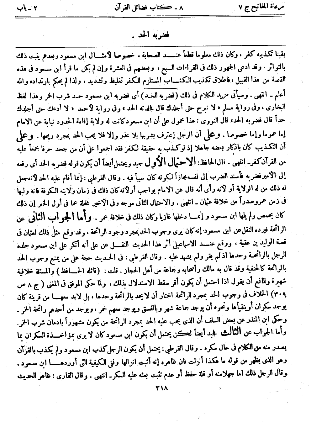يقيناً تكذيبه كفر، وكان ذلك معلوماًُ قطعاً عند الصحابة، خصوصاً لأمثال ابن مسعود وبعدهم يثبت ذلك بالتواتر. وقد ادعى الجمهور ذلك في القراءات السبع، وبعضهم في العشرة وإن لم يكن ما قرأ ابن مسعود في هذه القصة من هذا القبيل، فإطلاق تكذيب الكتاب المستلزم للكفر تغليظ وتشديد، ولذا لم يحكم بارتداده والله أعلم – انتهى. وسيأتي مزيد الكلام في ذلك (فضربه الحد) أي فضربه ابن مسعود حد شرب الخمر وهذا لفظ البخاري، وفي رواية مسلم "لا تبرح حتى أجلدك قال فجلدته الحد" وفي رواية لأحمد "لا أدعك حتى أجلدك حداً قال فضربه الحد" قال النووي: هذا محمول على أن ابن مسعود كانت له ولاية إقامة الحدود نيابة عن الإمام إما عموماً وإما خصوصاً. وعلى أن الرجل اعترف بشربها بلا عذر وإلا فلا يجب الحد بمجرد ريحها. وعلى أن التكذيب كان بإنكار بعضه جاهلاً إذ لو كذب به حقيقة لكفر فقد أجمعوا على أن من جحد حرفاً مجمعاً عليه من القرآن كفر – انتهى. قال الحافظ: الاحتمال الأول جيد ويحتمل أيضاً أن يكون قوله فضربه الحد أي رفعه إلى الأمير فضربه فأسند الضرب إلى نفسه مجازاً لكونه كان سبباً فيه. وقال القرطبي: إنما أقام عليه الحد لأنه جعل له ذلك من له الولاية أو لأنه رأى أنه قال عن الإمام بواجب أو لأنه كان ذلك في زمان ولايته الكوفة فإنه وليها في زمن عمر وصدراً من خلافة عثمان – انتهى. والاحتمال الثاني موجه وفي الأخير غفلة عما في أول الخبر إن ذلك كان بحمص ولم يلها ابن مسعود وإنما دخلها غازياً وكان ذلك في خلافة عمر. وأما الجواب الثاني عن الرائحة فيرده النقل عن ابن مسعود إنه كان يرى وجوب الحد بمجرد وجود الرائحة، وقد وقع مثل ذلك لعثمان في قصة الوليد بن عقبة، ووقع عند الإسماعيلي أثر هذا الحديث النقل عن علي أنه أنكر على ابن مسعود جلده الرجل بالرائحة وحدها إذ لم يقر ولم يشهد عليه. وقال القرطبي: في الحديث حجة على من يمنع وجوب الحد بالرائحة كالحنفية وقد قال به مالك وأصحابه وجماعة من أهل الحجاز. قلت: (قائله الحافظ) والمسئلة خلافية شهيرة وللمانع أن يقول إذا احتمل أن يكون أقر سقط الاستدلال بذلك، ولما حكى الموفق في المغنى (ج8ص309) الخلاف في وجوب الحد بمجرد الرائحة اختار أن لا يحد بالرائحة وحدها، بل لا بد معها من قرينة كان يوجد سكران أو يتقيأها ونحوه أن يوجد جماعة شهر وبالفسق ويوجد معهم خمر، ويوجد من أحدهم رائحة الخمر. وحكى ابن المنذر عن بعض السلف أن الذي يجب عليه الحد بمجرد الرائحة من يكون مشهوراً بإدمان شرب الخمر. وأما الجواب عن الثالث فجيد أيضاً لكن يحتمل أن يكون ابن مسعود كان لا يرى بمؤاخذة السكران بما يصدر منه من الكلام في حال سكره. وقال القرطبي: يحتمل أن يكون الرجل كذب ابن مسعود ولم يكذب بالقرآن وهو الذي يظهر من قوله ما هكذا أنزلت فإن ظاهره إنه أثبت إنزالها ونفي الكيفية التي أوردها ابن مسعود. وقال الرجل ذلك إما جهلاً منه أو قلة حفظ أو عدم تثبت بعثه عليه السكر – انتهى. وقال القاري: ظاهر الحديث