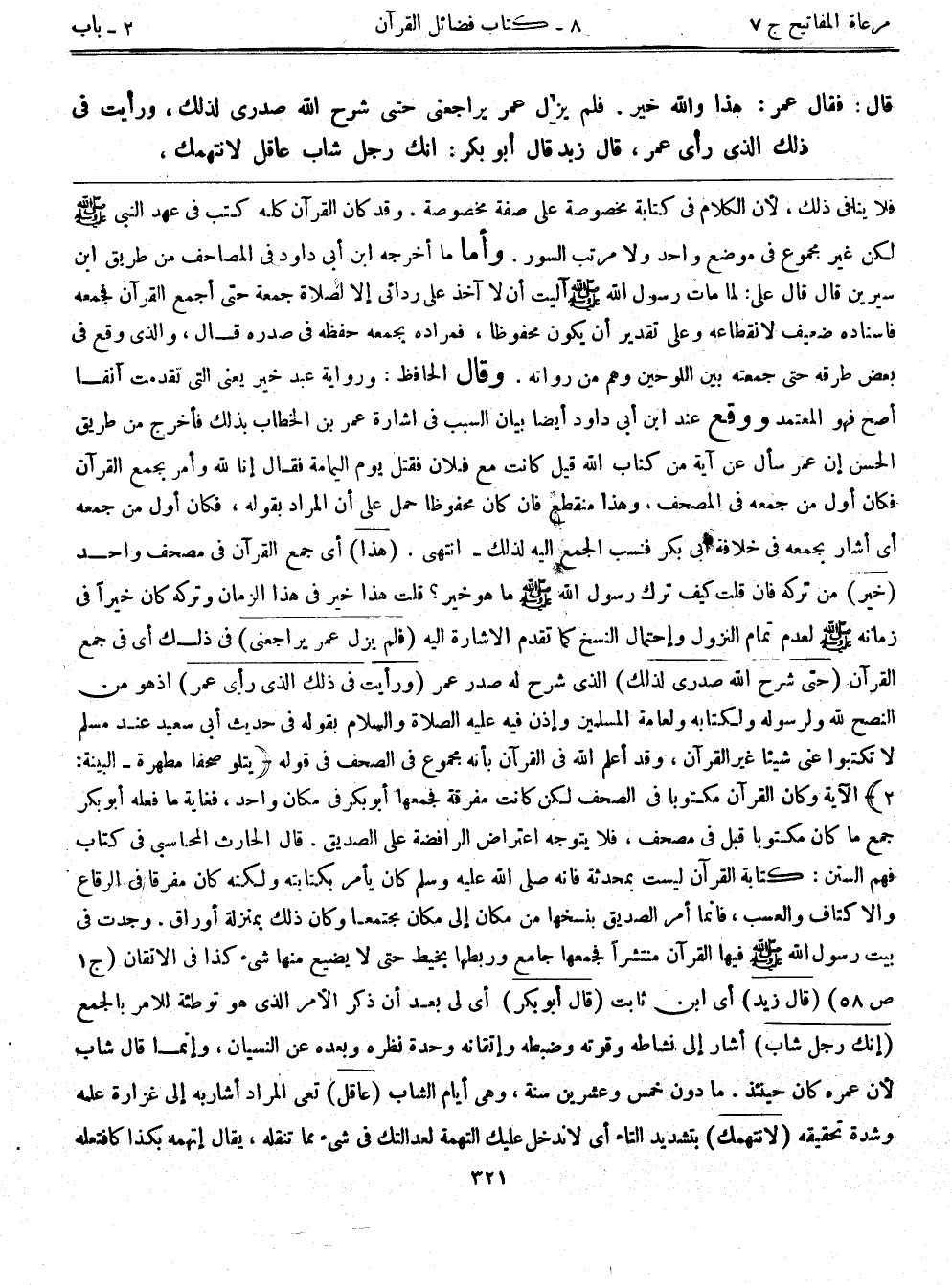 قال: فقال عمر: هذا والله خير. فلم يزل عمر يراجعني حتى شرح الله صدري لذلك، ورأيت في ذلك الذي رأى عمر، قال زيد قال أبوبكر: إنك رجل شاب عاقل لا نتهمك،