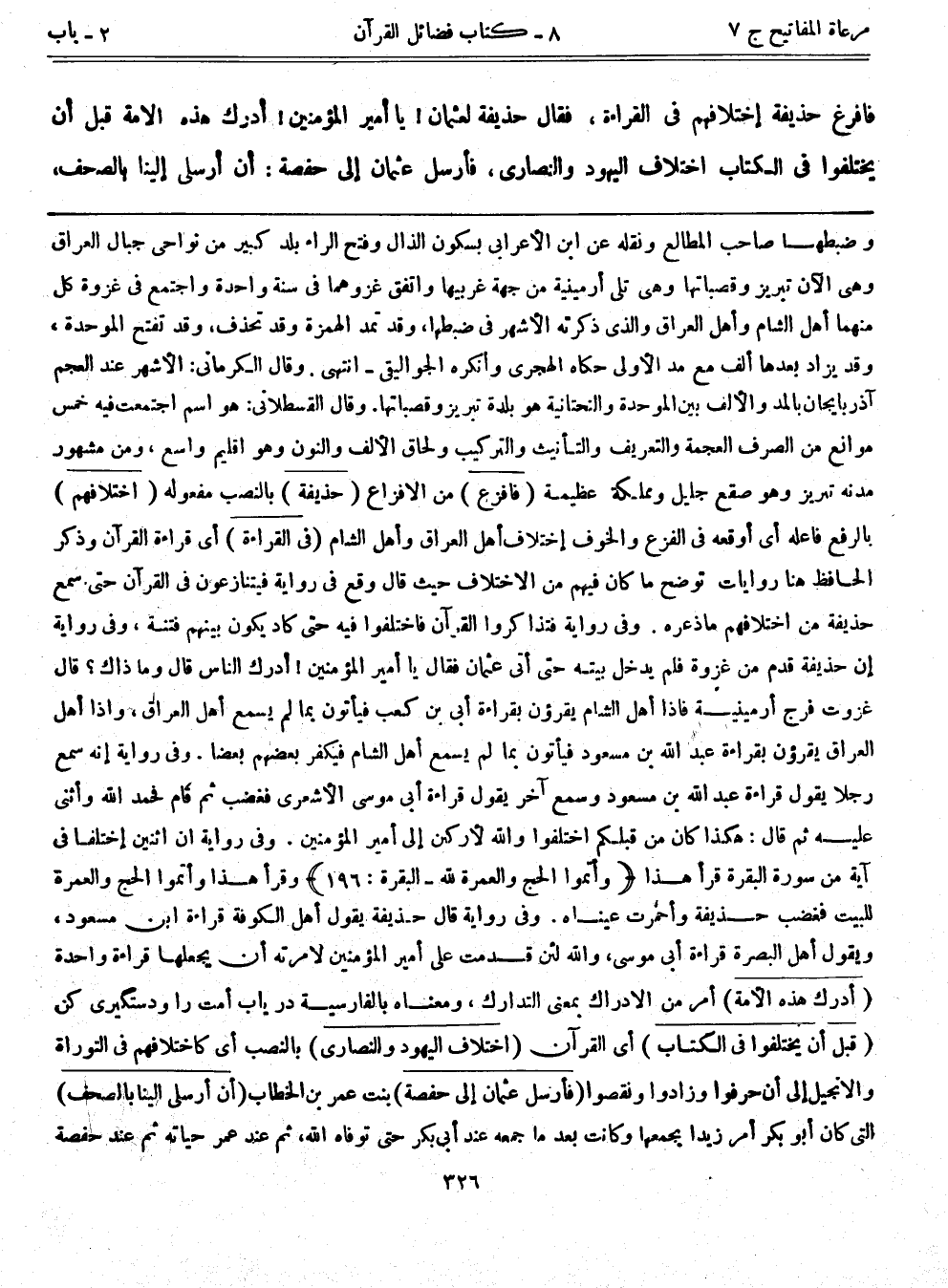 وضبطها صاحب المطالع ونقله عن ابن الأعرابي بسكون الذال وفتح الراء بلد كبير من نواحي جبال العراق وهي الآن تبريز وقصباتها وهي تلي أرمينية من جهة غربيها واتفق غزوهما في سنة واحدة واجتمع في غزوة كل منهما أهل الشام وأهل العراق والذي ذكرته الأشهر في ضبطها، وقد تمد الهمزة وقد تحذف، وقد تفتح الموحدة، وقد يزاد بعدها ألف مع مد الأولى حكاه الهجري وأنكره الجواليقي – انتهى. وقال الكرماني: الأشهر عند العجم آذر بيجان بالمد والألف بين الموحدة والتحتانية هو بلدة تبريز وقصباتها. وقال القسطلاني: هو اسم اجتمعت فيه خمس موانع من الصرف العجمة والتعريف والتأنيث والتركيب ولحاق الألف والنون وهو إقليم واسع، ومن مشهور مدنه تبريز وهو صقع جليل ومملكة عظيمة (فافزغ) من الافزاغ (حذيفة) بالنصب مفعوله (اختلافهم) بالرفع فاعله أي أوقعه في الفزع والخوف اختلاف أهل العراق وأهل الشام (في القراءة) أي قراءة القرآن وذكر الحافظ هنا روايات توضح ما كان فيهم من الاختلاف حيث قال وقع في رواية فيتنازعون في القرآن حتى سمع حذيفة من اختلافهم ما ذعره. وفي رواية فتذاكروا القرآن فاختلفوا فيه حتى كاد يكون بينهم فتنة، وفي رواية إن حذيفة قدم من غزوة فلم يدخل بيته حتى أتى عثمان فقال يا أمير المؤمنين! أدرك الناس قال وما ذاك؟ قال غزوت فرج أرمينية فإذا أهل الشام يقرؤن بقراءة أبي بن كعب فيأتون بما لم يسمع أهل العراق، وإذا أهل العراق يقرؤن بقراءة عبد الله بن مسعود فيأتون بما لم يسمع أهل الشام فيكفر بعضهم بعضاً. وفي رواية إنه سمع رجلاً يقول قراءة عبد الله بن مسعود وسمع آخر يقول قراءة أبي موسى الأشعري فغضب ثم قام فحمد الله وأثنى عليه ثم قال: هكذا كان من قبلكم اختلفوا والله لأركبن إلى أمير المؤمنين. وفي رواية إن اثنين اختلفا في آية من سورة البقرة قرأ هذا {وأتموا الحج والعمرة لله} [البقرة: 196] وقرأ هذا وأتموا الحج والعمرة للبيت فغضب حذيفة وأحمرت عيناه. وفي رواية قال حذيفة يقول أهل الكوفة قراءة ابن مسعود، ويقول أهل البصرة قراءة أبي موسى، والله لئن قدمت على أمير المؤمنين لامرته أن يجعلها قراءة واحدة (أدرك هذه الأمة) أمر من الإدراك بمعنى التدارك، ومعناه بالفارسية درياب أمت راودستكيري كن (قبل أن يختلفوا في الكتاب) أي القرآن (اختلاف اليهود والنصارى) بالنصب أي كاختلافهم في التوراة والإنجيل إلى أن حرفوا وزادوا ونقصوا (فأرسل عثمان إلى حفصة) بنت عمر بن الخطاب (أن أرسلي إلينا بالصحف) التي كان أبوبكر أمر زيداً بجمعها وكانت بعد ما جمعه عند أبي بكر حتى توفاه الله، ثم عند عمر حياته ثم عند حفصة
