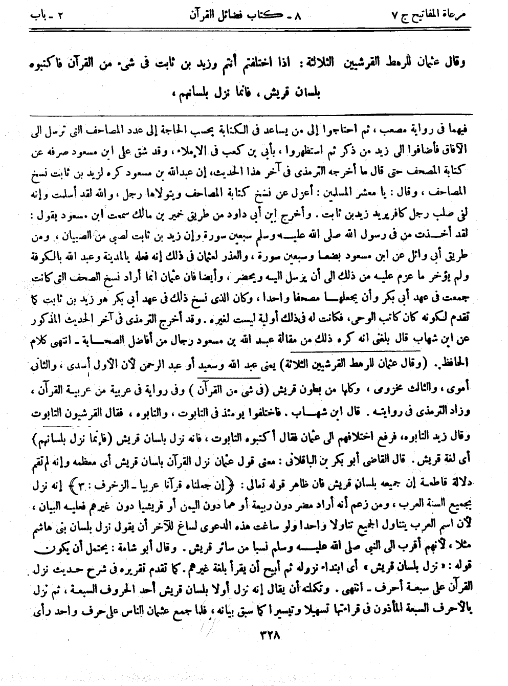 وقال عثمان للرهط القرشيين الثلاثة: إذا اختلفتم أنتم وزيد بن ثابت في شي من القرآن فاكتبوه بلسان قريش، فإنما نزل بلسانهم،