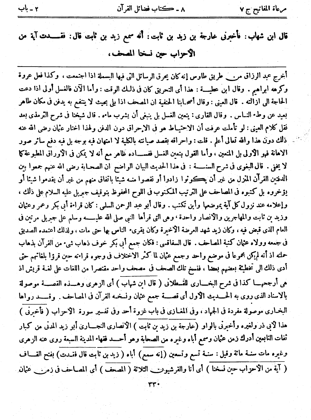 قال ابن شهاب: فأخبرني خارجة بن زيد بن ثابت: أنه سمع زيد بن ثابت قال: فقدت آية من الأحزاب حين نسخنا المصحف،