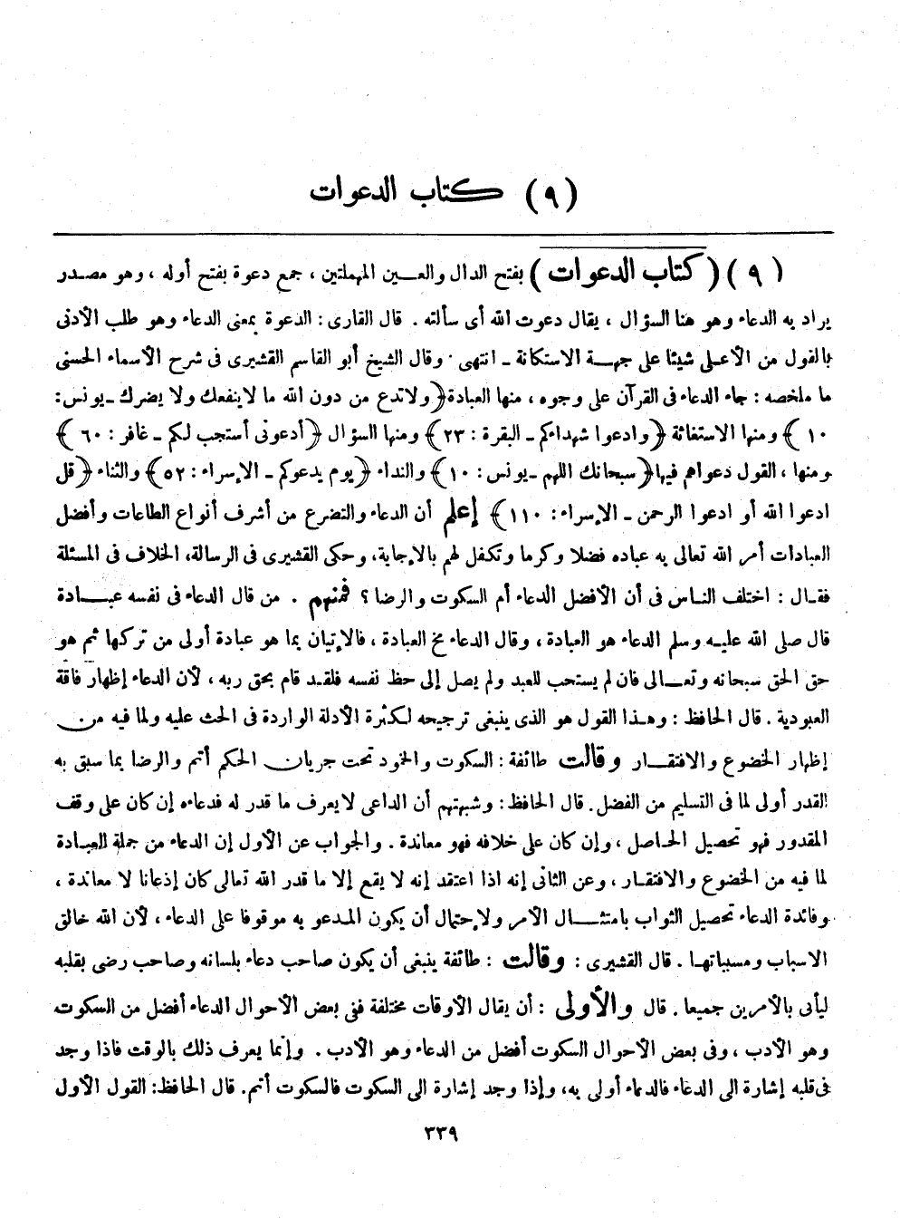 (9) (كتاب الدعوات) بفتح الدال والعين المهملتين، جمع دعوة بفتح أوله، وهو مصدر يراد به الدعاء وهو هنا السؤال، يقال دعوت الله أي سألته. قال القاري: الدعوة بمعنى الدعاء وهو طلب الأدنى بالقول من الأعلى شيئاً على جهة الاستكانة - انتهى. وقال الشيخ أبوالقاسم القشيري في شرح الأسماء الحسنى ما ملخصه: جاء الدعاء في القرآن على وجوه، منها العبادة {ولا تدع من دون الله ما لا ينفعك ولا يضرك} [يونس: 10] ومنها الاستغاثة {وادعوا شهداءكم} [البقرة: 23] ومنها السؤال {ادعوني أستجب لكم} [غافر: 60] ومنها، القول دعواهم فيها {سبحانك اللهم} [يونس: 10] والنداء {يوم يدعوكم} [الإسراء: 52] والثناء {قل ادعوا الله أو ادعوا الرحمن} [الإسراء: 110] اعلم أن الدعاء والتضرع من أشرف أنواع الطاعات وأفضل العبادات أمر الله تعالى به عباده فضلاً وكرماً وتكفل لهم بالإجابة، وحكى القشيري في الرسالة، الخلاف في المسألة فقال: اختلف الناس في أن الأفضل الدعاء أم السكوت والرضا؟ فمنهم من قال الدعاء في نفسه عبادة قال صلى الله عليه وسلم الدعاء هو العبادة، وقال الدعاء مخ العبادة، فالإتيان بما هو عبادة أولى من تركها ثم هو حق الحق سبحانه وتعالى فإن لم يستحب للعبد ولم يصل إلى حظ نفسه فلقد قام بحق ربه، لأن الدعاء إظهار فاقة العبودية. قال الحافظ: وهذا القول هو الذي ينبغي ترجيحه لكثرة الأدلة الواردة في الحث عليه ولما فيه من إظهار الخضوع والافتقار وقالت طائفة: السكوت والخمود تحت جريان الحكم أتم والرضا بما سبق به القدر أولى لما في التسليم من الفضل. قال الحافظ: وشبهتهم أن الداعي لا يعرف ما قدر له فدعاءه إن كان على وقف المقدور فهو تحصيل الحاصل، وإن كان على خلافه فهو معاندة. والجواب عن الأول إن الدعاء من جملة العبادة لما فيه من الخضوع والافتقار، وعن الثاني إنه إذا اعتقد إنه لا يقع إلا ما قدر الله تعالى كان إذعاناً لا معاندة، وفائدة الدعاء تحصيل الثواب بامتثال الأمر ولاحتمال أن يكون المدعو به موقوفاً على الدعاء، لأن الله خالق الأسباب ومسبباتها. قال القشيري: وقالت طائفة: ينبغي أن يكون صاحب دعاء بلسانه وصاحب رضي بقلبه ليأتي بالأمرين جميعاً. قال الأولى: أن يقال الأوقات مختلفة ففي بعض الأحوال الدعاء أفضل من السكوت وهو الأدب، وفي بعض الأحوال السكوت أفضل من الدعاء وهو الأدب. وإنما يعرف ذلك بالوقت فإذا وجد في قلبه إلى الدعاء فالدعاء أولى به، وإذا وجد إشارة إلى السكوت فالسكوت أتم. قال الحافظ: القول الأول