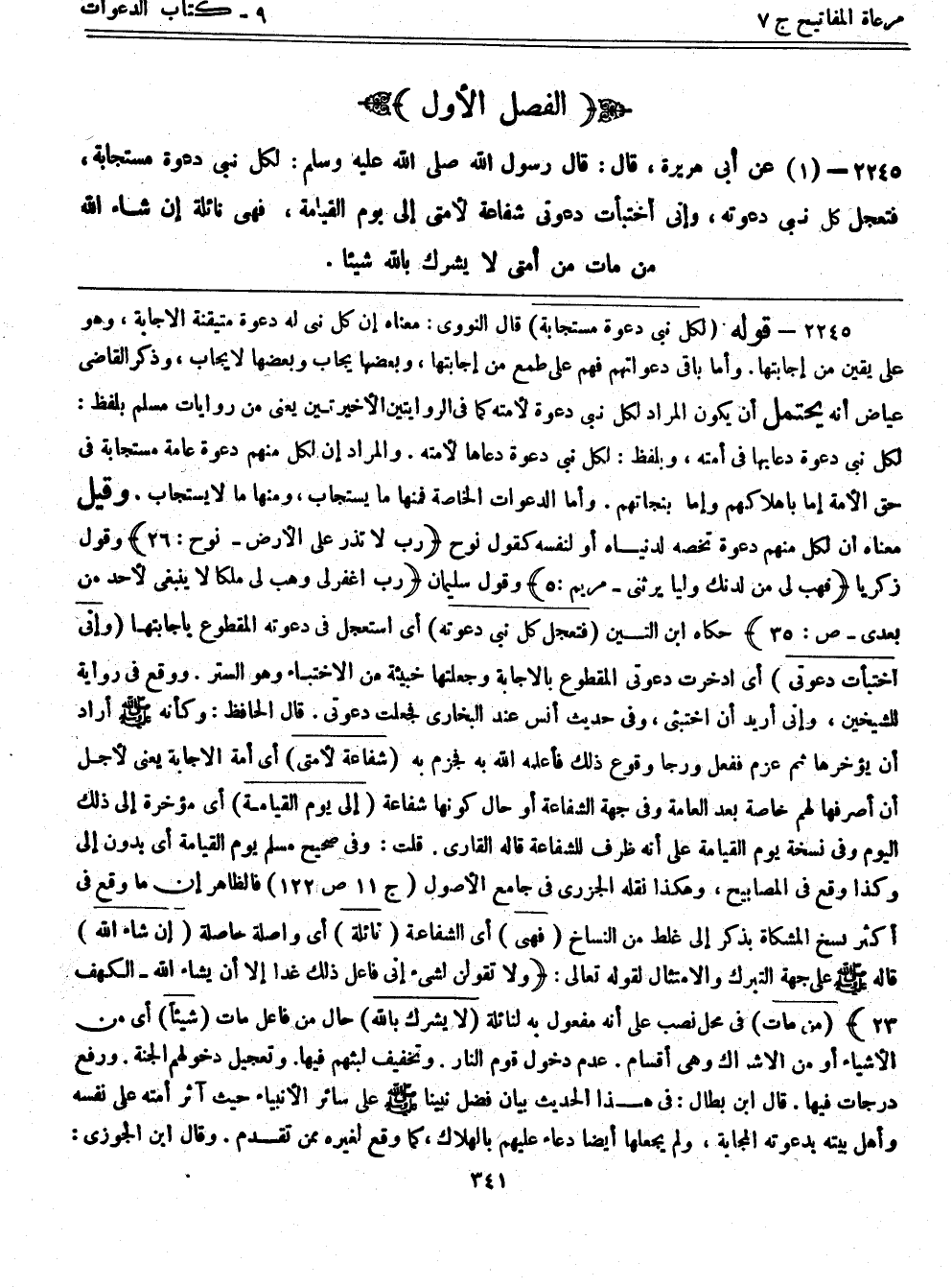 2245- قوله: (لكل نبي دعوة مستجابة) قال النووي: معناه إن كل نبي له دعوة متيقنة الإجابة، وهو على يقين من إجابتها. وأما باقي دعواتهم فهم على طمع من إجابتها، وبعضها يجاب وبعضها لا يجاب، وذكر القاضي عياض أنه يحتمل أن يكون المراد لكل نبي دعوة لأمته كما في الروايتين الأخيريتين يعني من روايات مسلم بلفظ: لكل نبي دعوة دعا بها في أمته، وبلفظ: لكل نبي دعوة دعاها لأمته. والمراد إن لكل منهم دعوة عامة مستجابة في حق الأمة إما بإهلاكهم وإما بنجاتهم. وأما الدعوات الخاصة فمنها ما يستجاب، ومنها ما لا يستجاب. وقيل معناه إن لكل منهم دعوة تخصه لدنياه أو لنفسه كقول نوح {رب لا تذر على الأرض} [نوح: 26] وقول زكريا {فهب لي من لدنك ولياً يرثني} [مريم: 5] وقول سليمان {رب اغفر لي وهب لي ملكاً لا ينبغي لأحد من بعدي} [ص35] حكاه ابن التين (فتجعل كل نبي دعوته) أي استعجل في دعوته المقطوع بإجابتها وإني اختبأت دعوتي) أي ادخرت دعوتي المقطوع بالإجابة وجعلتها خبيئة من الاختباء وهو الستر. ووقع في رواية للشيخين، وإني أريد أن اختبىء، وفي حديث أنس عند البخاري فجعلت دعوتي. قال الحافظ: وكأنه - صلى الله عليه وسلم - أراد أن يؤخرها ثم عزم ففعل ورجا وقوع ذلك فأعلمه الله به فجزم به (شفاعة لأمتي) أي أمة الإجابة يعني لأجل أن أصرفها لهم خاصة بعد العامة وفي جهة الشفاعة أو حال كونها شفاعة (إلى يوم القيامة) أي مؤخرة إلى ذلك اليوم وفي نسخة يوم القيامة على أنه ظرف للشفاعة قاله القاري. قلت: وفي صحيح مسلم يوم القيامة أي بدون إلى وكذا وقع في المصابيح، وهكذا نقله الجزري في جامع الأصول (ج11ص 122) فالظاهر إن ما وقع في أكثر نسخ المشكاة بذكر إلى غلط من النساخ فهي) أي الشفاعة (نائلة) أي واصلة حاصلة (إن شاء الله) قاله - صلى الله عليه وسلم - على جهة التبرك والامتثال لقوله تعالى: {ولا تقولن لشي إني فاعل ذلك غداً إلا أن يشاء الله} [الكهف: 23] (من مات) في محل نصب على أنه مفعول به لنائلة (لا يشرك بالله) حال من فاعل مات (شيئاً) أي من الأشياء أو من الإشراك وهي أقسام. عدم دخول قوم النار. وتخفيف لبثهم فيها. وتعجيل دخولهم الجنة. ورفع درجات فيها. قال ابن بطال: في هذا الحديث بيان فضل نبينا - صلى الله عليه وسلم - على سائر الأنبياء حيث آثر أمته على نفسه وأهل بيته بدعوته المجابة، ولم يجعلها أيضاً دعاء عليهم بالهلاك، كما وقع لغيره ممن تقدم. وقال ابن الجوزي: