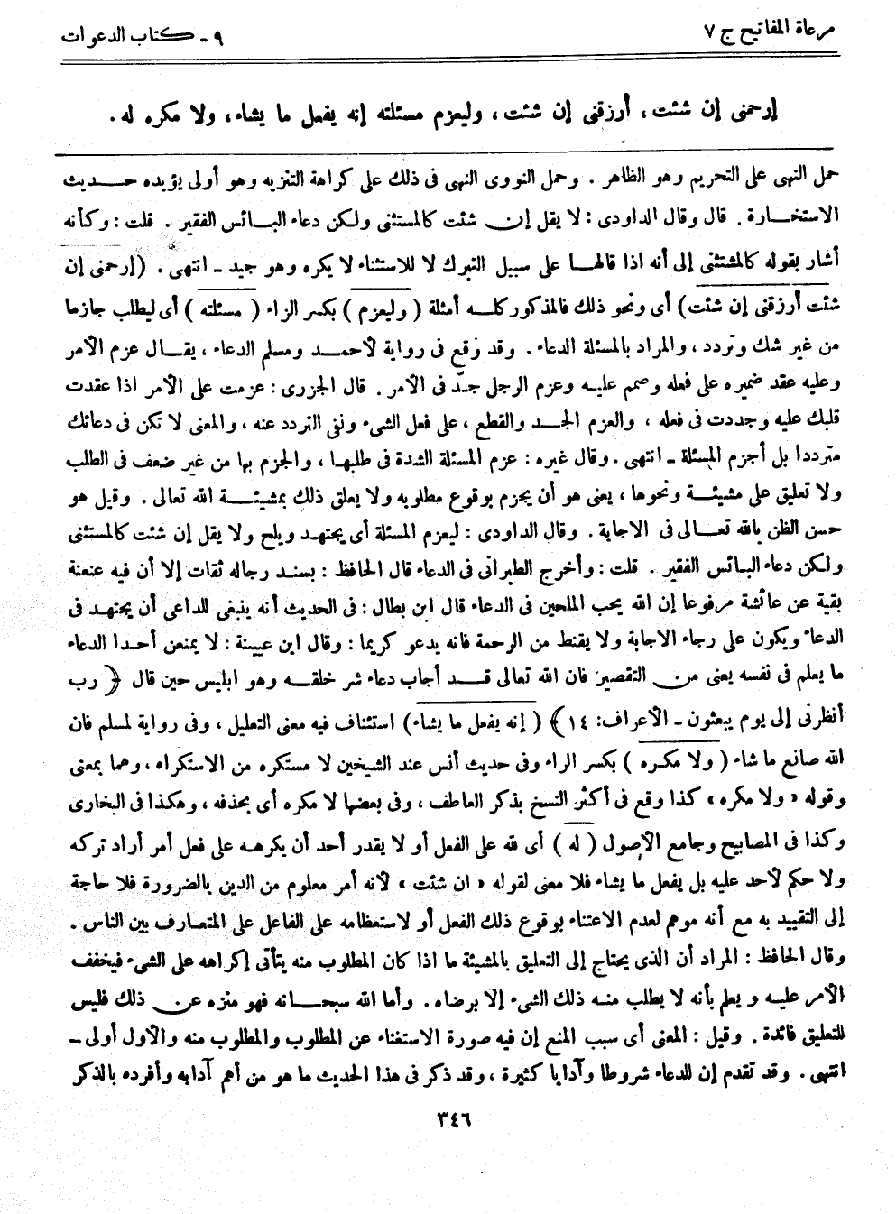 حمل النهي على التحريم وهو الظاهر. وحمل النووي النهي في ذلك على كراهة التنزيه وهو أولى يؤيده حديث الاستخارة. قال وقال الداودي: لا يقل إن شئت كالمستثنى ولكن دعاء البائس الفقير. قلت: وكأنه أشار بقوله كالمستثنى إلى أنه إذا قالها على سبيل التبرك لا للاستثناء لا يكره وهو جيد – انتهى. (ارحمني إن شئت ارزقني إن شئت) أي ونحو ذلك فالمذكور كله أمثلة (وليعزم) بكسر الزاء (مسئلته) أي ليطلب جازماً من غير شك وتردد، والمراد بالمسألة الدعاء. وقد وقع في رواية لأحمد ومسلم الدعاء، يقال عزم الأمر وعليه عقد ضميره على فعله وصمم عليه وعزم الرجل جدّ في الأمر. قال الجزري: عزمت على الأمر إذا عقدت قلبك عليه وجددت في فعله، والعزم الجد والقطع، على فعل الشيء ونفي التردد عنه، والمعنى لا تكن في دعائك متردداً بل أجزم المسألة – انتهى. وقال غيره: عزم المسألة الشدة في طلبها، والجزم بها من غير ضعف في الطلب ولا تعليق على مشيئة ونحوها، يعني هو أن يجزم بوقوع مطلوبة ولا يعلق ذلك بمشيئة الله تعالى. وقيل هو حسن الظن بالله تعالى في الإجابة. وقال الداودي: ليعزم المسألة أي يجتهد ويلح ولا يقل إن شئت كالمستثنى ولكن دعاء البائس الفقير. قلت: وأخرج الطبراني في الدعاء قال الحافظ: بسند رجاله ثقات إلا أن فيه عنعنة بقية عن عائشة مرفوعاً (إن الله يحب الملحين في الدعاء) قال ابن بطال: في الحديث أنه ينبغي للداعي أن يجتهد في الدعاء ويكون على رجاء الإجابة ولا يقنط من الرحمة فإنه يدعوا كريماً: وقال ابن عيينة: لا يمنعن أحداً الدعاء ما يعلم في نفسه يعني من التقصير فإن الله تعالى قد أجاب دعاء شر خلقه وهو إبليس حين قال {رب أنظرني إلى يوم يبعثون} [الأعراف: 14] (إنه يفعل ما يشاء) استئناف فيه معنى التعليل، وفي رواية لمسلم فإن الله صانع ما شاء (ولا مكره) بكسر الراء وفي حديث أنس عند الشيخين لا مستكره من الاستكراه، وهما بمعنى وقوله "ولا مكره" كذا وقع في أكثر النسخ بذكر العاطف، وفي بعضها لا مكره أي بحذفه، وهكذا في البخاري وكذا في المصابيح وجامع الأصول (له) أي لله على الفعل أو لا يقدر أحد أن يكرهه على فعل أمر أراد تركه ولا حكم لأحد عليه بل يفعل ما يشاء فلا معنى لقوله "إن شئت" لأنه أمر معلوم من الدين بالضرورة فلا حاجة إلى التقييد به مع أنه موهم لعدم الاعتناء بوقوع ذلك الفعل أو لاستعظامه على الفاعل على المتعارف بين الناس. وقال الحافظ: المراد أن الذي يحتاج إلى التعليق بالمشيئة ما إذا كان المطلوب منه يتأتي إكراهه على الشيء فيخفف الأمر عليه ويعلم بأنه لا يطلب منه ذلك الشيء إلا برضاه. وأما الله سبحانه فهو منزه عن ذلك فليس للتعليق فائدة. وقيل: المعنى أي سبب المنع إن فيه صورة الاستغناء عن المطلوب والمطلوب منه والأول أولى – انتهى. وقد تقدم إن للدعاء شروطاً وآداباً كثيرة، وقد ذكر في هذا الحديث ما هو من أهم آدابه وأفرده بالذكر