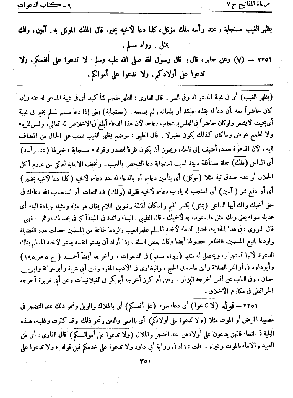 2251- قوله: (لا تدعوا) أي دعاء سوء (على أنفسكم) أي بالهلاك والويل ونحو ذلك عند التضجر في مصيبة المرض أو الموت مثلا (ولا تدعوا على أولادكم) أي بالعمى واللعن ونحو ذلك وقد كثرت وغلبت هذه البلية في النساء فإنهن يدعون على أولادهن عند الضجر والملال (ولا تدعوا على أموالكم) قال القاري: أي من العبيد والإماء بالموت وغيره. قلت: زاد في رواية أبي داود ولا تدعوا على خدمكم قبل قوله "ولا تدعوا على