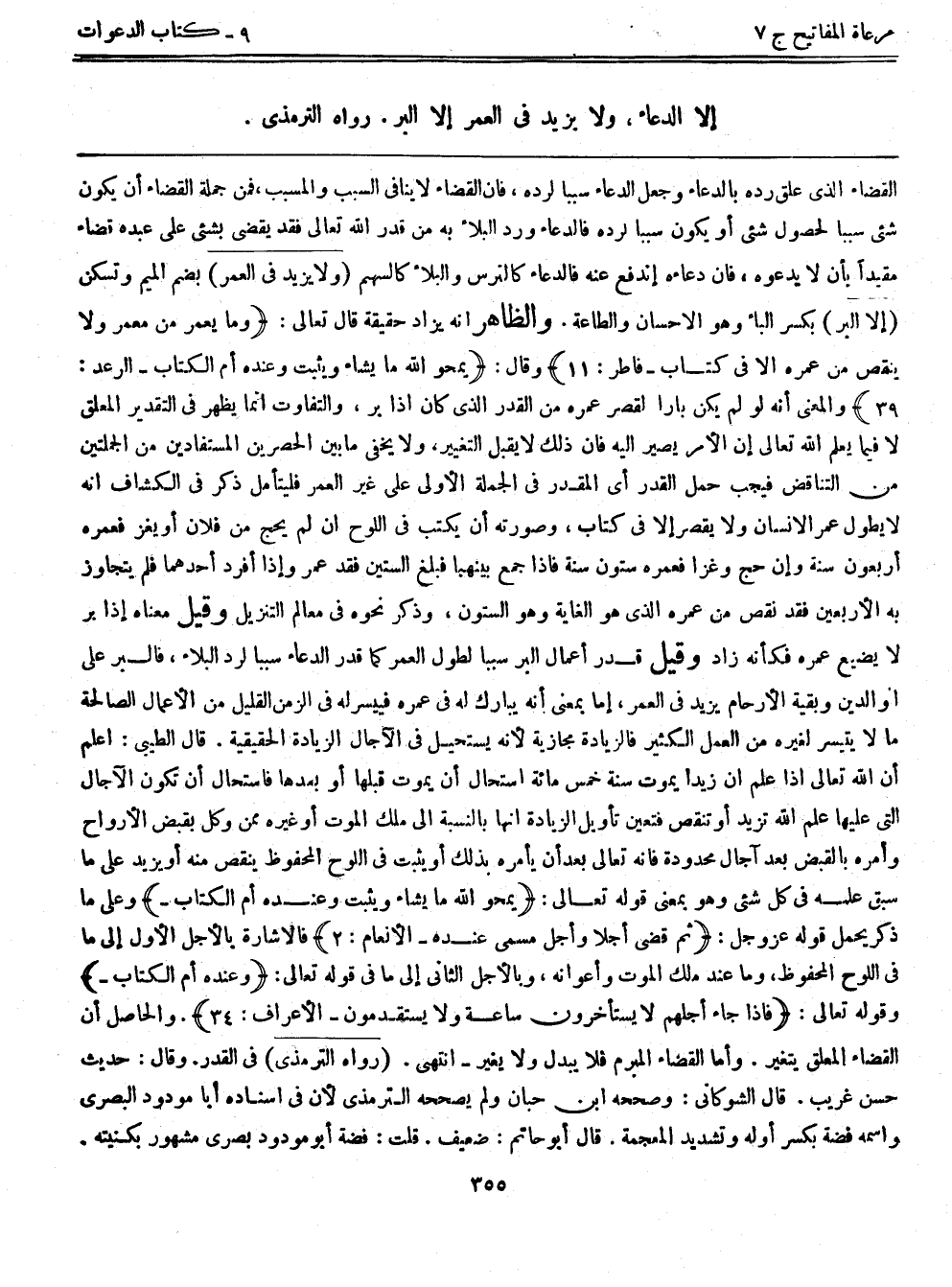 القضاء الذي علق رده بالدعاء وجعل الدعاء سبباً لرده، فإن القضاء لا ينافي السبب والمسبب، فمن جملة القضاء أن يكون شيء سبباً لحصول شيء أو يكون سبباً لرده فالدعاء ورد البلاء به من قدر الله تعالى فقد يقضى بشي على عبده قضاء مقيداً بأن لا يدعوه، فإن دعاءه اندفع عنه فالدعاء كالترس والبلاء كالسهم (ولا يزيد في العمر) بضم الميم وتسكن (إلا البر) بكسر الباء وهو الإحسان والطاعة. والظاهر إنه يزاد حقيقة قال تعالى: {وما يعمر من معمر ولا ينقص من عمره إلا في كتاب} [فاطر: 11] وقال: {يمحو الله ما يشاء ويثبت وعنده أم الكتاب} [الرعد: 39] والمعنى أنه لو لم يكن باراً لقصر عمره من القدر الذي كان إذا بر، والتفاوت إنما يظهر في التقدير المعلق لا فيما يعلم الله تعالى إن الأمر يصير إليه فإن ذلك لا يقبل التغيير، ولا يخفي ما بين الحصرين المستفادين من الجملتين من التناقض فيجب حمل القدر أي المقدر في الجملة الأولى على غير العمر فليتأمل ذكر في الكشاف إنه لا يطول عمر الإنسان ولا يقصر إلا في كتاب، وصورته أن يكتب في اللوح إن لم يحج فلان أو يغز فعمره أربعون سنة وإن حج وغزا فعمره ستون سنة فإذا جمع بينهما فبلغ الستين فقد عمر وإذا أفرد أحدهما فلم يتجاوز به الأربعين فقد نقص من عمره الذي هو الغاية وهو الستون، وذكر نحوه في معالم التنزيل وقيل معناه إذا بر لا يضيع عمره فكأنه زاد وقيل قدر أعمال البر سبباً لطول العمر كما قدر الدعاء سبباً لرد البلاء، فالبر على الوالدين وبقية الأرحام يزيد في العمر، إما بمعنى أنه يبارك له في عمره فييسر له في الزمن القليل من الأعمال الصالحة ما لا يتيسر لغيره من العمل الكثير فالزيادة مجازية لأنه يستحيل في الآجال الزيادة الحقيقية. قال الطيبي: اعلم أن الله تعالى إذا علم أن زيداً يموت سنة خمس مائة استحال أن يموت قبلها أو بعدها فاستحال أن تكون الآجال التي عليها علم الله تزيد أو تنقص فتعين تأويل الزيادة إنها النسبة إلى ملك الموت أو غيره ممن وكل بقبض الأرواح وأمره بالقبض بعد آجال محدودة فإنه تعالى بعد أن يأمره بذلك أو يثبت في اللوح المحفوظ ينقص منه أو يزيد على ما سبق علمه في كل شيء وهو بمعنى قوله تعالى: {يمحو الله ما يشاء ويثبت وعنده أم الكتاب} وعلى ما ذكر يحمل قوله عزوجل {ثم قضى أجلاً وأجل مسمى عنده} [الأنعام: 2] فالإشارة بالأجل الأول إلى ما في اللوح المحفوظ، وما عند ملك الموت وأعوانه، وبالأجل الثاني إلى ما في قوله تعالى: {وعنده أم الكتاب} وقوله تعالى: {فإذا جاء أجلهم لا يستأخرون ساعة ولا يستقدمون} [الأعراف: 34] والحاصل أن القضاء المعلق يتغير. وأما القضاء المبرم فلا يبدل ولا يغير - انتهى. (رواه الترمذي) في القدر. وقال: حديث حسن غريب. قال الشوكاني: وصححه ابن حبان ولم يصححه الترمذي لأن في إسناده أبا مودود البصري واسمه فضة بكسر أوله وتشديد المعجمة. قال أبوحاتم: ضعيف. قلت: فضة أبومودود بصري مشهور بكنيته.