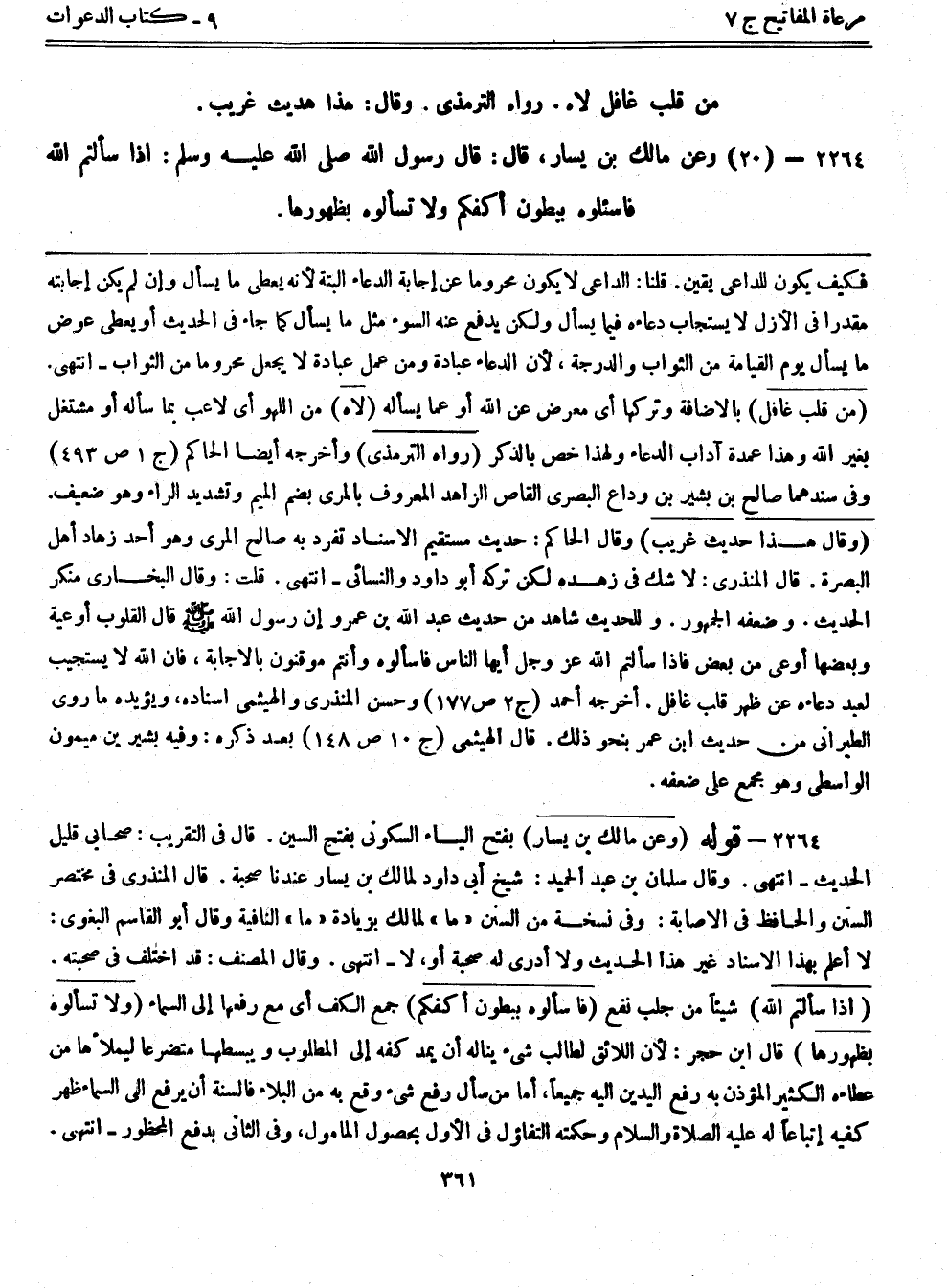 فكيف يكون للداعي يقين. قلنا: الداعي لا يكون محروماً عن إجابة الدعاء البتة لأنه يعطي ما يسأل وإن لم يكن إجابته مقدراً في الأزل لا يستجاب دعاءه فيما يسأل ولكن يدفع عنه السوء مثل ما يسأل كما جاء في الحديث أو يعطي عوض ما يسأل يوم القيامة من الثواب والدرجة، لأن الدعاء عبادة ومن عمل عبادة لا يجعل محروماً من الثواب – انتهى. (من قلب غافل) بالإضافة وتركها أي معرض عن الله أو عما يسأله (لاه) من اللهو أي لاعب بما سأله أو مشتغل بغير الله وهذا عمدة آداب الدعاء ولهذا خص بالذكر (رواه الترمذي) وأخرجه أيضاً الحاكم (ج1ص493) وفي سندهما صالح بن بشير بن وداع البصري القاص الزاهد المعروف بالمرى بضم الميم وتشديد الراء وهو ضعيف. (وقال هذا حديث غريب) وقال الحاكم: حديث مستقيم الإسناد تفرد به صالح المرى وهو أحد زهاد أهل البصرة. قال المنذري: لا شك في زهده لكن تركه أبوداود والنسائي – انتهى. قلت: وقال البخاري منكر الحديث. وضعفه الجمهور. وللحديث شاهد من حديث عبد الله بن عمرو إن رسول الله - صلى الله عليه وسلم - قال القلوب أوعية وبعضها أوعي من بعض فإذا سألتم الله عزوجل أيها الناس فاسألوه وأنتم موقنون بالإجابة، فإن الله لا يستجيب لعبد دعاءه عن ظهر قلب غافل. أخرجه أحمد (ج2ص177) وحسن المنذري والهيثمي إسناده، ويؤيده ما روى الطبراني من حديث ابن عمر بنحو ذلك. قال الهيثمي (ج10ص148) بعد ذكره: وفيه بشير بن ميمون الواسطي وهو مجمع على ضعفه.