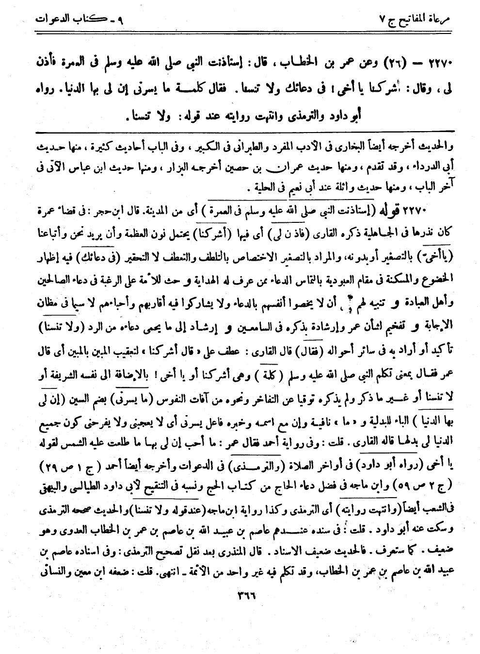 2270- قوله: (استأذنت النبي صلى الله عليه وسلم في العمرة) أي من المدينة. قال ابن حجر: في قضاء عمرة كان نذرها في الجاهلية ذكره القاري (فأذن لي) أي فيها (أشركنا) يحتمل نون العظمة وأن يريد نحن وأتباعنا (يا أخيّ) بالتصغير أو بدونه، والمراد بالتصغير الاختصاص بالتلطف والتعطف لا التحقير (في دعائك) في إظهار الخضوع والمسكنة في مقام العبودية بالتماس الدعاء ممن عرف له الهداية وحث للأمة على الرغبة في دعاء الصالحين وأهل العبادة وتنبيه لهم أن لا يخصوا أنفسهم بالدعاء ولا يشاركوا فيه أقاربهم وأحباءهم لا سيما في مظان الإجابة وتفخيم لشأن عمر وإرشادة بذكره في السامعين وإرشاد إلى ما يحمى دعاءه من الرد (ولا تنسنا) تأكيد أو أراد به في سائر أحواله (فقال) قال القاري: عطف على "قال أشركنا" لتعقيب المبين بالمبين أي قال عمر فقال بمعنى تكلم النبي صلى الله عليه وسلم (كلمة) وهي أشركنا أو يا أخي! بالإضافة إلى نفسه الشريفة أو لا تنسنا أو غير ما ذكر ولم يذكره توقياً عن التفاخر ونحوه من آفات النفوس (ما يسرني) بضم السين (إن لي بها الدنيا) الباء للبدلية و "ما" نافية وإن مع اسمه وخبره فاعل يسرني أي لا يعجبني ولا يفرحني كون جميع الدنيا لي بدلها قاله القاري. قلت: وفي رواية أحمد فقال عمر: ما أحب إن لي بها ما طلعت عليه الشمس لقوله يا أخي (رواه أبوداود) في أواخر الصلاة (والترمذي) في الدعوات وأخرجه أيضاً أحمد (ج1ص29) (ج2ص59) وابن ماجه في فضل دعاء الحاج من كتاب الحج ونسبة في التنقيح لأبي داود الطيالسي والبيهقي في الشعب أيضاً (وانتهت روايته) أي الترمذي وكذا رواية ابن ماجه (عند قوله ولا تنسنا) والحديث صححه الترمذي وسكت عنه أبوداود. قلت: في سنده عندهم عاصم بن عبيد الله بن عاصم بن عمر بن الخطاب العدوي وهو ضعيف. كما ستعرف. فالحديث ضعيف الإسناد. قال المنذري بعد نقل تصحيح الترمذي: وفي إسناده عاصم بن عبيد الله بن عاصم بن عمر بن الخطاب، وقد تكلم فيه غير واحد من الأئمة – انتهى. قلت: ضعفه ابن معين والنسائي