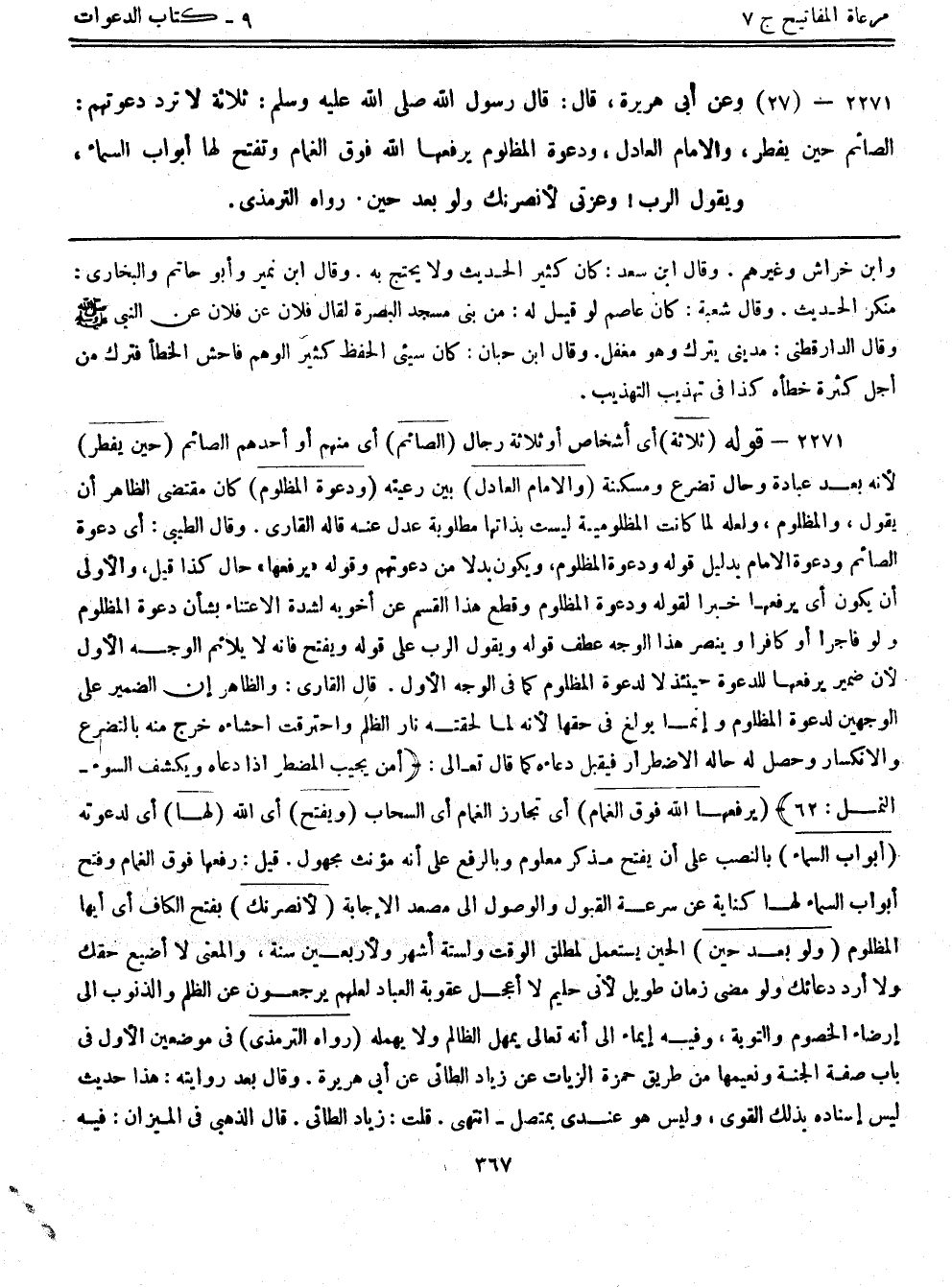 2271- قوله: (ثلاثة) أي أشخاص أو ثلاثة رجال (الصائم) أي منهم أو أحدهم الصائم (حين يفطر) لأنه بعد عبادة وحال تضرع ومسكنة (والإمام العادل) بين رعيته (ودعوة المظلوم) كان مقتضى الظاهر أن يقول، والمظلوم، ولعله لما كانت المظلومية ليست بذاتها مطلوبة عدل عنه قاله القاري. وقال الطيبي: أي دعوة الصائم ودعوة الإمام بدليل قوله ودعوة المظلوم، ويكون بدلا من دعوتهم وقوله "يرفعها" حال كذا قيل، والأولى أن يكون أي يرفعها خبراً لقوله ودعوة المظلوم وقطع هذا القسم عن أخويه لشدة الاعتناء بشأن دعوة المظلوم ولو فاجراً أو كافراً وينصر هذا الوجه عطف قوله ويقول الرب على قوله ويفتح فإنه لا يلائم الوجه الأول لأن ضمير يرفعها للدعوة حينئذ لا لدعوة المظلوم كما في الوجه الأول. قال القاري: والظاهر إن الضمير على الوجهين لدعوة المظلوم وإنما بولغ في حقها لأنه لما لحقته نار الظلم واحترقت أحشاءه خرج منه بالتضرع والانكسار وحصل له حاله الاضطرار فيقبل دعاءه كما قال تعالى: {أمن يجيب المضطر إذا دعاه ويكشف السوء} [النمل: 62] (يرفعها الله فوق الغمام) أي تجاوز الغمام أي السحاب (ويفتح) أي الله (لها) أي لدعوته (أبواب السماء) بالنصب على أن يفتح مذكر معلوم وبالرفع على أنه مؤنث مجهول. قيل: رفعها فوق الغمام وفتح أبواب السماء لها كناية عن سرعة القبول والوصول إلى مصعد الإجابة (لأنصرنك) بفتح الكاف أي أيها المظلوم (ولو بعد حين) الحين يستعمل لمطلق الوقت ولستة أشهر ولأربعين سنة، والمعنى لا أضيع حقك ولا أرد دعائك ولو مضي زمان طويل لأني حليم لا أعجل عقوبة العباد لعلهم يرجعون عن الظلم والذنوب إلى إرضاء الخصوم والتوبة، وفيه إيماء إلى أنه تعالى يمهل ولا يهمله (رواه الترمذي) في موضعين الأول في باب صفة الجنة ونعيمها من طريق حمزة الزيات عن زياد الطائي عن أبي هريرة. وقال بعد روايته: هذا حديث ليس إسناده بذلك القوى، وليس هو عندي بمتصل – انتهى. قلت: زياد الطائي. قال الذهبي في الميزان: فيه