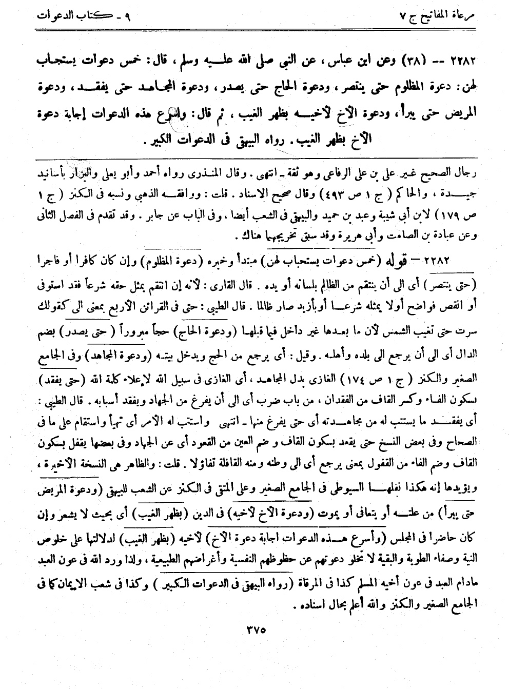 2282- قوله: (خمس دعوات يستجاب لهن) مبتدأ وخبره (دعوة المظلوم) وإن كان كافراً أو فاجراً (حتى ينتصر) أي إلى أن ينتقم من الظالم بلسانه أو يده. قال القاري: لأنه إن انتقم بمثل حقه شرعاً فقد استوفى أو انقص فواضح أولاً بمثله شرعاً أو بأزيد صار ظالماً. قال الطيبي: حتى في القرائن الأربع بمعنى إلى كقولك سرت حتى تغيب الشمس لأن ما بعدها غير داخل فيما قبلها (ودعوة الحاج) حجاً مبروراً (حتى يصدر) بضم الدال أي إلى أن يرجع إلى بلده وأهله. وقيل: أي يرجع من الحج ويدخل بيته (ودعوة المجاهد) وفي الجامع الصغير والكنز (ج1ص174) الغازي بدل المجاهد، أي الغازي في سبيل الله لإعلاء كلمة الله (حتى يفقد) بسكون الفاء وكسر القاف من الفقدان، من باب ضرب أي إلى أن يفرغ من الجهاد ويفقد أسبابه. قال الطيبي: أي يفقد ما يستتب له من مجاهدته أي حتى يفرغ منها – انتهى. واستتب له الأمر أي تهيأ واستقام على ما في الصحاح وفي بعض النسخ حتى يقعد بسكون القاف وضم العين من القعود أي عن الجهاد وفي بعضها يقفل بسكون القاف وضم الفاء من القفول بمعنى يرجع أي إلى وطنه ومنه القافلة تفاؤلاً. قلت: والظاهر هي النسخة الأخيرة، ويؤيدها إنه هكذا نقلها السيوطي في الجامع الصغير وعلى المتقي في الكنز عن الشعب للبيهقي (ودعوة المريض حتى يبرأ) من علته أو يتعافى أو يموت (ودعوة الأخ لأخيه) في الدين (بظهر الغيب) أي بحيث لا يشعر وإن كان حاضراً في المجلس (وأسرع هذه الدعوات إجابة دعوة الأخ) لأخيه (بظهر الغيب) لدلالتها على خلوص النية وصفاء الطوية والبقية لا تخلو دعوتهم عن حظوظهم النفسية وأغراضهم الطبيعية، ولذا ورد الله في عون العبد ما دام العبد في عون أخيه المسلم كذا في المرقاة (رواه البيهقي في الدعوات الكبير) وكذا في شعب الإيمان كما في الجامع الصغير والكنز والله أعلم بحال إسناده.