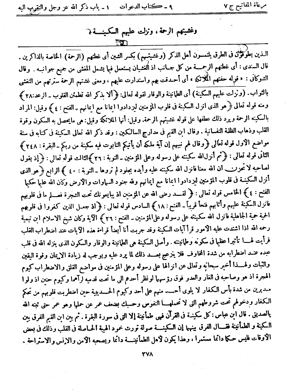 الذين يطوفون في الطرق يلتمسون أهل الذكر (وغشيتهم) بكسر الشين أي غطتهم (الرحمة) الخاصة بالذاكرين. قال السندي: أي غطتهم الرحمة من كل جانب إذ الغشيان يستعمل فيما يشمل المغشي من جميع جوانبه. وقال الشوكاني: "قوله حفتهم الملائكة" أي أحدقت بهم واستدارت عليهم، ومعنى غشتهم الرحمة سترتهم من التغشي بالثواب. (ونزلت عليهم السكينة) أي الطمأنينة والوقار لقوله تعالى: {ألا بذكر الله تطمئن القلوب} [الرعد: 28] ومنه قوله تعالى: {هو الذي أنزل السكينة في قلوب المؤمنين ليزدادوا إيماناً مع إيمانهم} [الفتح:4] وقيل: المراد بالسكينة الرحمة ويرد ذلك عطفها على قوله غشيتهم الرحمة. وقيل: أنها الملائكة وقيل: هي ما يحصل به السكون وقوة القلب وذهاب الظلمة النفسانية. وقال ابن القيم في مدارج السالكين: وقد ذكر الله تعالى السكينة في كتابه في ستة مواضع الأول قوله تعالى: {وقال لهم نبيهم إن آية ملكه أن يأتيكم التابوت فيه سكينة من ربكم} [البقرة: 248] الثاني قوله تعالى: {ثم أنزل الله سكينته على رسوله وعلى المؤمنين} [التوبة:26] الثالث قوله تعالى: {إذ يقول لصاحبه لا تحزن إن الله معنا فأنزل الله سكينته عليه وأيده بجنود لم تروها} [التوبة: 40] الرابع {هو الذي أنزل السكينة في قلوب المؤمنين ليزدادوا إيماناً مع إيمانهم ولله جنود السموات والأرض وكان الله عليماً حكيماً} [الفتح: 4] الخامس قوله تعالى: {لقد رضي الله عن المؤمنين إذ يبايعونك تحت الشجرة فعلم ما في قلوبهم فأنزل السكينة عليهم وأثابهم فتحاً قريباً} [الفتح: 18] السادس قوله تعالى: {إذ جعل الذين كفروا في قلوبهم الحمية حمية الجاهلية فأنزل الله سكينته على رسوله وعلى المؤمنين} الآية [الفتح: 26] وكان شيخ الإسلام ابن تيمية رحمه الله إذا اشتدت عليه الأمور قرأ آيات السكينة وقد جربت أنا أيضاً قراءة هذه الآيات عند اضطراب القلب فرأيت لها تأثيراً عظيماً في سكونه وطمأنينته. وأصل السكينة هي الطمأنينة والوقار والسكون الذي ينزله الله في قلب عبده عند اضطرابه من شدة المخاوف فلا ينزعج بعد ذلك لما يرد عليه ويوجب له زيادة الإيمان وقوة اليقين والثبات ولهذا أخبر سبحانه وتعالى عن إنزالها على رسوله وعلى المؤمنين في مواضع القلق والاضطراب كيوم الهجرة إذ هو وصاحبه في الغار والعدو فوق رؤسهما لو نظر أحدهم إلى ما تحت قدميه لرآهما وكيوم حنين إذ ولو مدبرين من شدة بأس الكفار لا يلوي أحد منهم على أحد وكيوم الحديبية حين اضطربت قلوبهم من تحكم الكفار ودخولهم تحت شروطهم التي تحملها النفوس وحسبك بضعف عمر عن حملها وهو عمر حتى ثبته الله بالصديق. قال ابن عباس: كل سكينة في القرآن فهي طمأنينة إلا التي في سورة البقرة. ثم بين ابن القيم الفرق بين السكينة والطمأنينة فقال الفرق بينهما إن السكينة صولة تورث خمود الهيبة الحاصلة في القلب وذلك في بعض الأوقات فليس حكماً دائما مستمراً، وهذا يكون لأهل الطمأنينة دائماً ويصحبه الأمن والإنس والاستراحة.