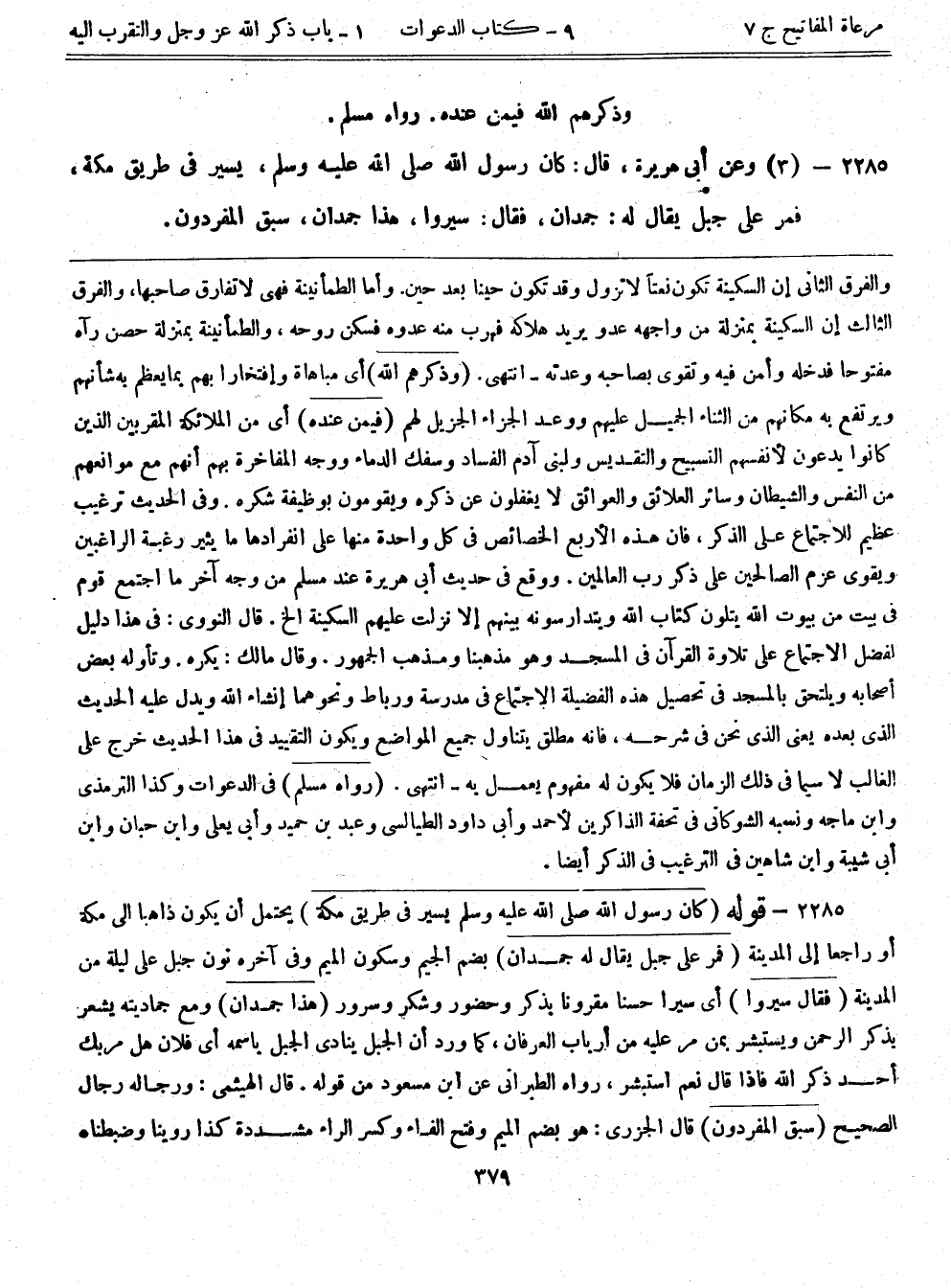 2285- قوله: (كان رسول الله صلى الله عليه وسلم يسير في طريق مكة) يحتمل أن يكون ذاهباً إلى مكة أو راجعاً إلى المدينة (فمر على جبل يقال له جمدان) بضم الجيم وسكون الميم وفي آخره نون جبل على ليلة من المدينة (فقال سيروا) أي سيراً حسناً مقروناً بذكر وحضور وشكر وسرور (هذا جمدان) ومع جماديته يشعر بذكر الرحمن ويستبشر بمن مر عليه من أرباب العرفان، كما ورد أن الجبل ينادي الجبل باسمه أي فلان هل مربك أحد ذكر الله فإذا قال نعم استبشر، رواه الطبراني عن ابن مسعود من قوله. قال الهيثمي: ورجاله رجال الصحيح (سبق المفردون) قال الجزري: هو بضم الميم وفتح الفاء وكسر الراء مشددة كذا روينا وضبطنا