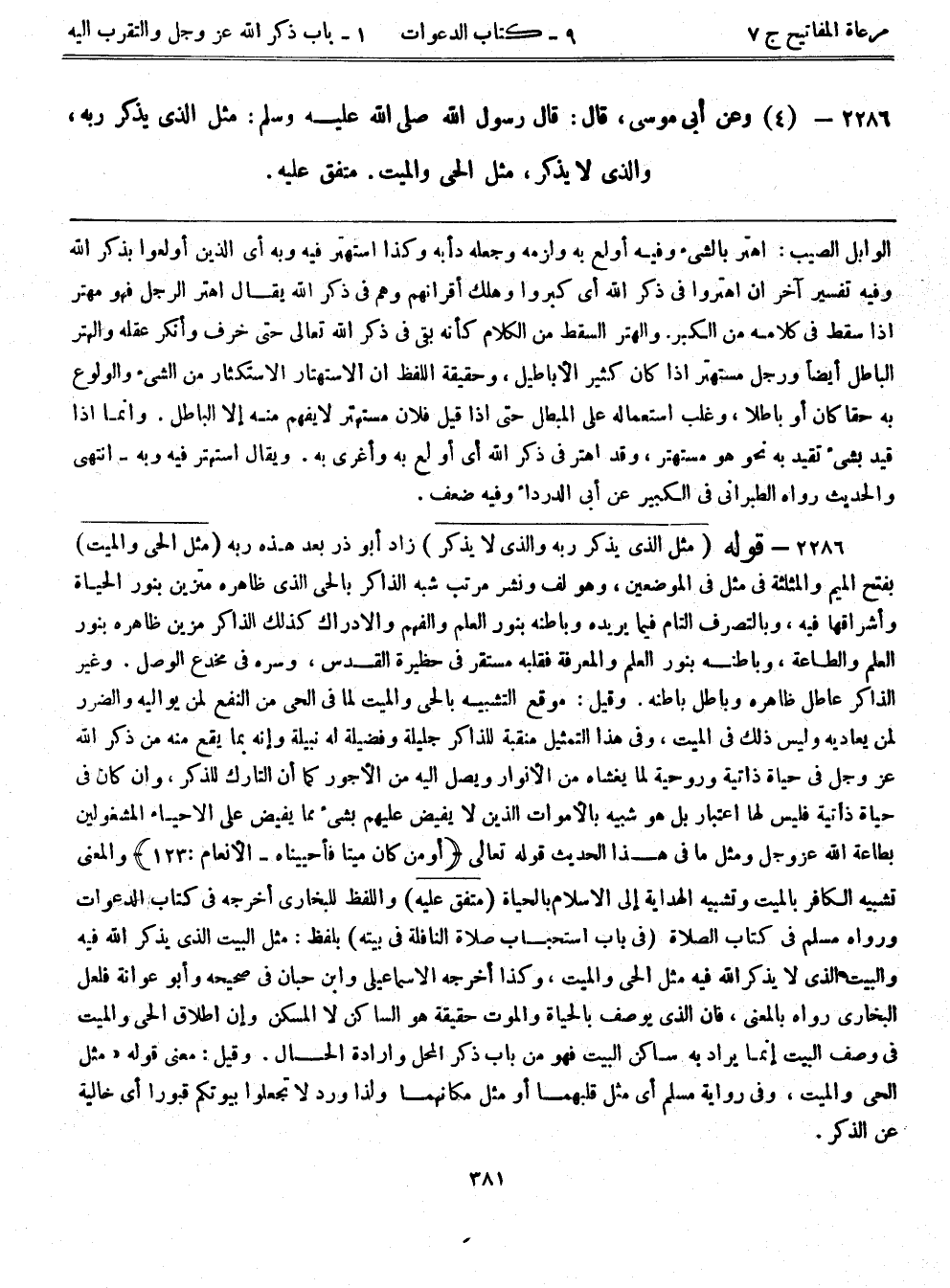 2286- (4) وعن أبي موسى، قال: قال رسول الله صلى الله عليه وسلم: ((مثل الذي يذكر ربه، والذي لا يذكر، مثل الحي والميت)) . متفق عليه.