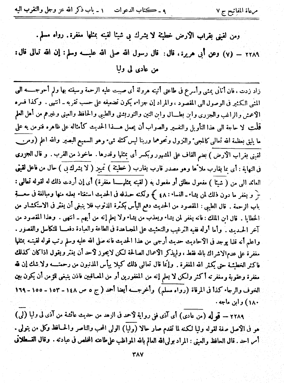 2289- (7) وعن أبي هريرة، قال: قال رسول الله صلى الله عليه وسلم: ((إن الله تعالى قال: من عاد لي ولياً