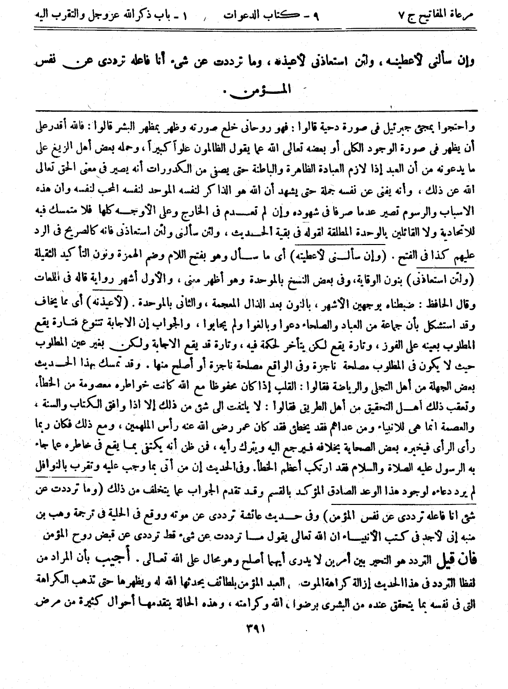 وإن سألني لأعطينه، ولئن استعاذني لأعيذنه، وما ترددت عن شيء أنا فاعله ترددي عن نفس المؤمن.