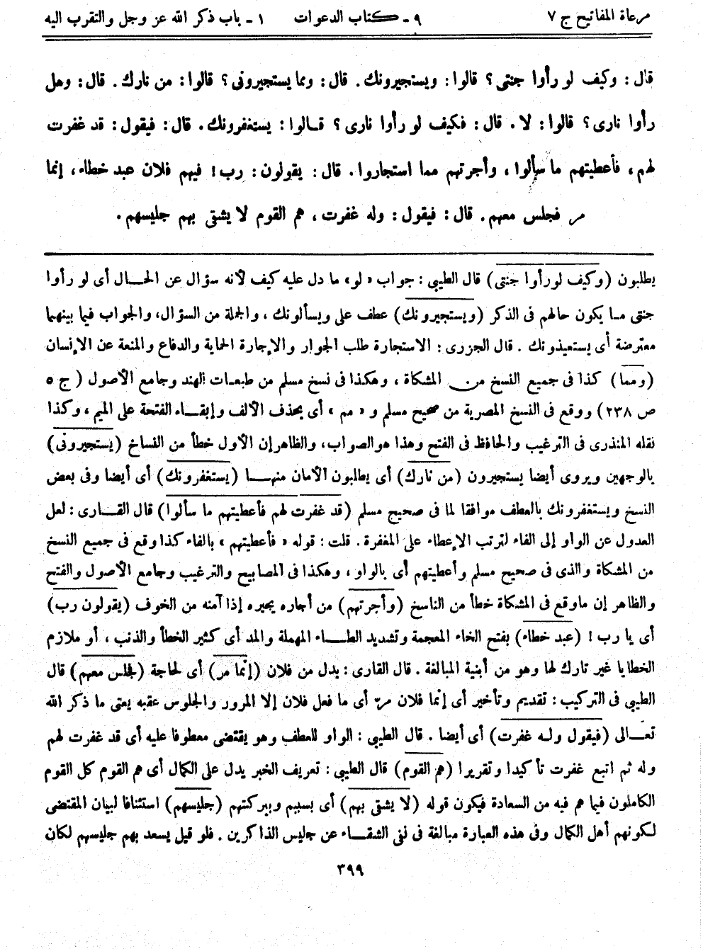 يطلبون (وكيف لو رأوا جنتي) قال الطيبي: جواب "لو" ما دل عليه كيف لأنه سؤال عن الحال أي لو رأوا جنتي ما يكون حالهم في الذكر (ويستجيرونك) عطف على ويسألونك، والجملة من السؤال، والجواب فيما بينهما معترضة أي يستعيذونك. قال الجزري: الاستجارة طلب الجوار والإجارة الحماية والدفاع والمنعة عن الإنسان (ومما) كذا في جميع النسخ من المشكاة، وهكذا في نسخ مسلم من طبعات الهند وجامع الأصول (ج5ص238) ووقع في النسخ المصرية من صحيح مسلم و"مم" أي بحذف الألف وإبقاء الفتحة على الميم، وكذا نقله المنذري في الترغيب والحافظ في الفتح وهذا هو الصواب، والظاهر إن الأول خطأ من النساخ (يستجيروني) بالوجهين ويرو أيضاً يستجيرون (من نارك) أي يطلبون الأمان منها (يستغفرونك) أي أيضاً وفي بعض النسخ ويستغفرونك بالعطف موافقاً لما في صحيح مسلم (قد غفرت لهم فأعطيتهم ما سألوا) قال القاري: لعل العدول عن الواو إلى الفاء لترتب الإعطاء على المغفرة. قلت: قوله "فأعطيتهم" بالفاء كذا وقع في جميع النسخ من المشكاة والذي في صحيح مسلم وأعطيتهم أي بالواو، وهكذا في المصابيح والترغيب وجامع الأصول والفتح والظاهر إن ما وقع في المشكاة خطأ من الناسخ (وأجرتهم) من أجاره يجيره إذا آمنه من الخوف (يقولون رب) أي يا رب! (عبد خطأ) بفتح الخاء المعجمة وتشديد الطاء المهملة والمد أي كثير الخطأ والذنب، أو ملازم الخطايا غير تارك لها وهو من أبنية المبالغة. قال القاري: بدل من فلان (إنما مر) أي لحاجة (فجلس معهم) قال الطيبي في التركيب: تقديم وتأخير أي إنما فلان مرّ أي ما فعل فلان إلا المرور والجلوس عقبه يعني ما ذكر الله تعالى (فيقول وله غفرت) أي أيضاً. قال الطيبي: الواو للعطف وهو يقتضي معطوفاً عليه أي قد غفرت لهم وله ثم اتبع غفرت تأكيداً وتقريراً (هم القوم) قال الطيبي: تعريف الخبر يدل على الكمال أي هم القوم كل القوم الكاملون فيما هم فيه من السعادة فيكون قوله (لا يشقى بهم) أي بسببهم وببركتهم (جليسهم) استئنافاً لبيان المقتضى لكونهم أهل الكمال وفي هذه العبارة مبالغة في نفي الشقاء عن جليس الذاكرين. فلو قيل يسعد بهم جليسهم لكان