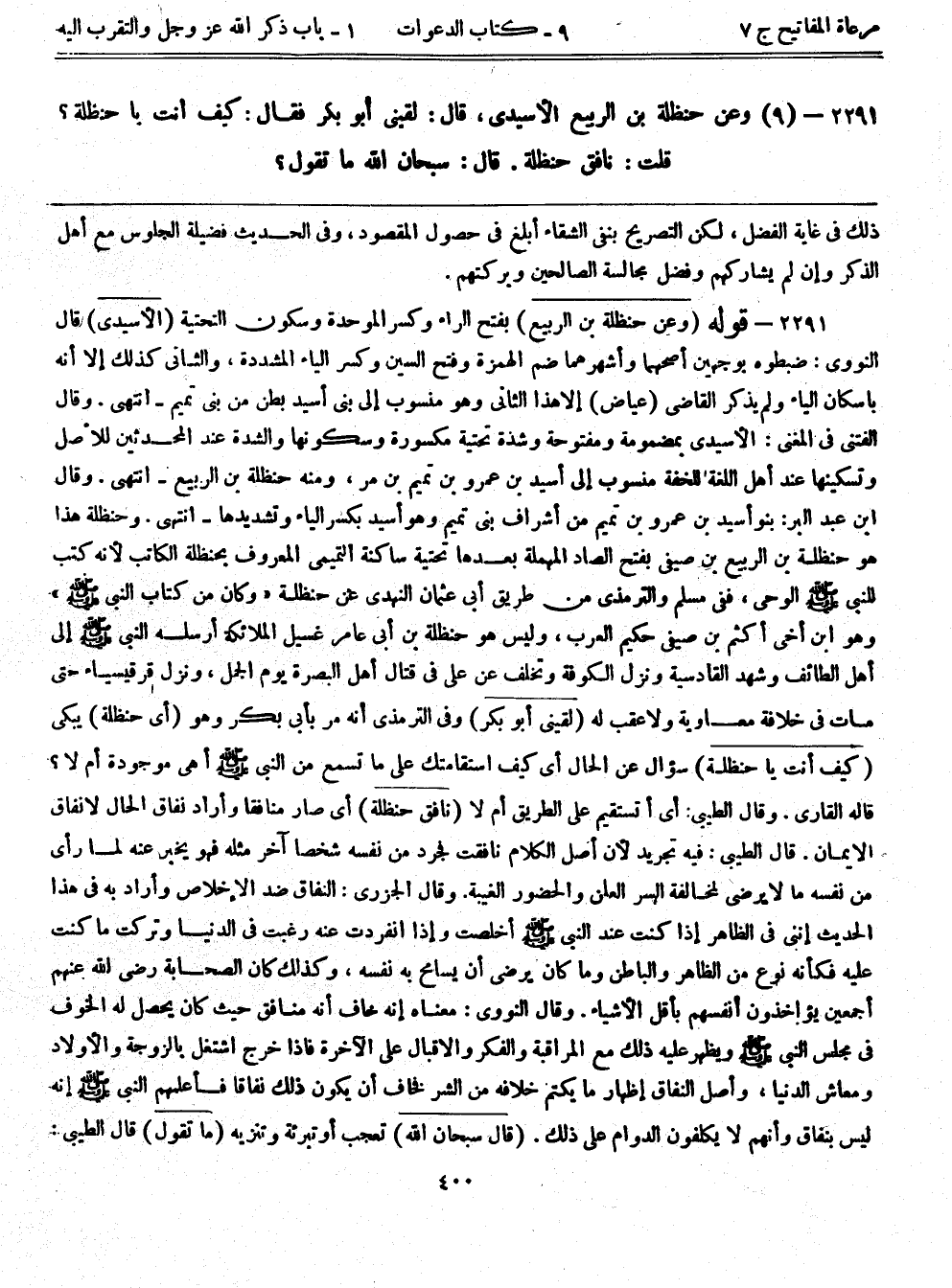 2291- (9) وعن حنظلة بن الربيع الأسيدي، قال: ((لقيني أبوبكر فقال: كيف أنت يا حنظلة؟ قلت: نافق حنظلة. قال: سبحان الله ما تقول؟