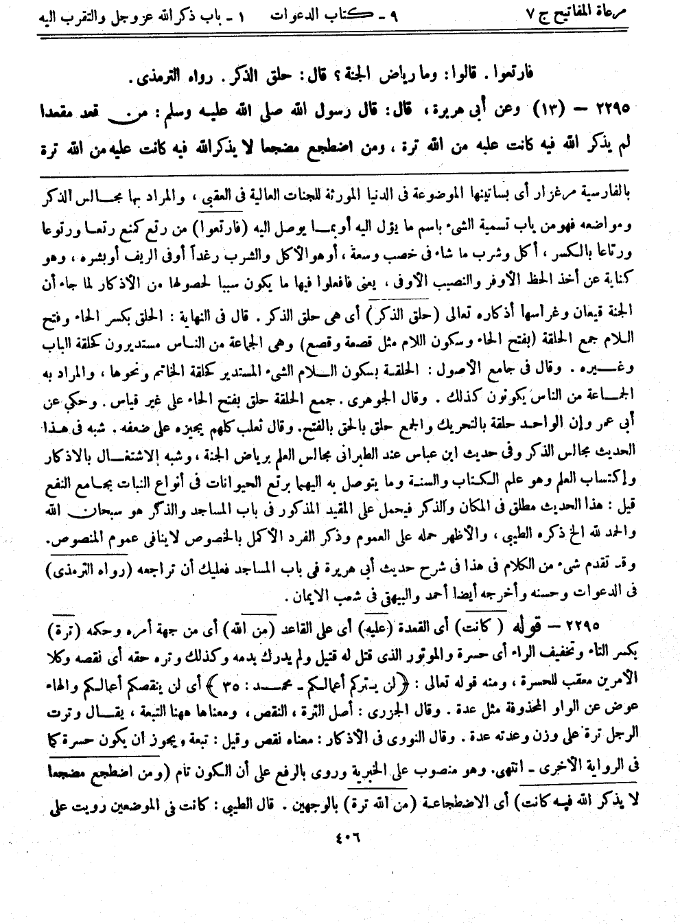2295- (13) وعن أبي هريرة، قال: قال رسول الله صلى الله عليه وسلم: ((من قعد مقعداً لم يذكر الله فيه كانت عليه من الله ترة، ومن اضطجع مضجعا لا يذكر الله فيه كانت عليه من الله ترة