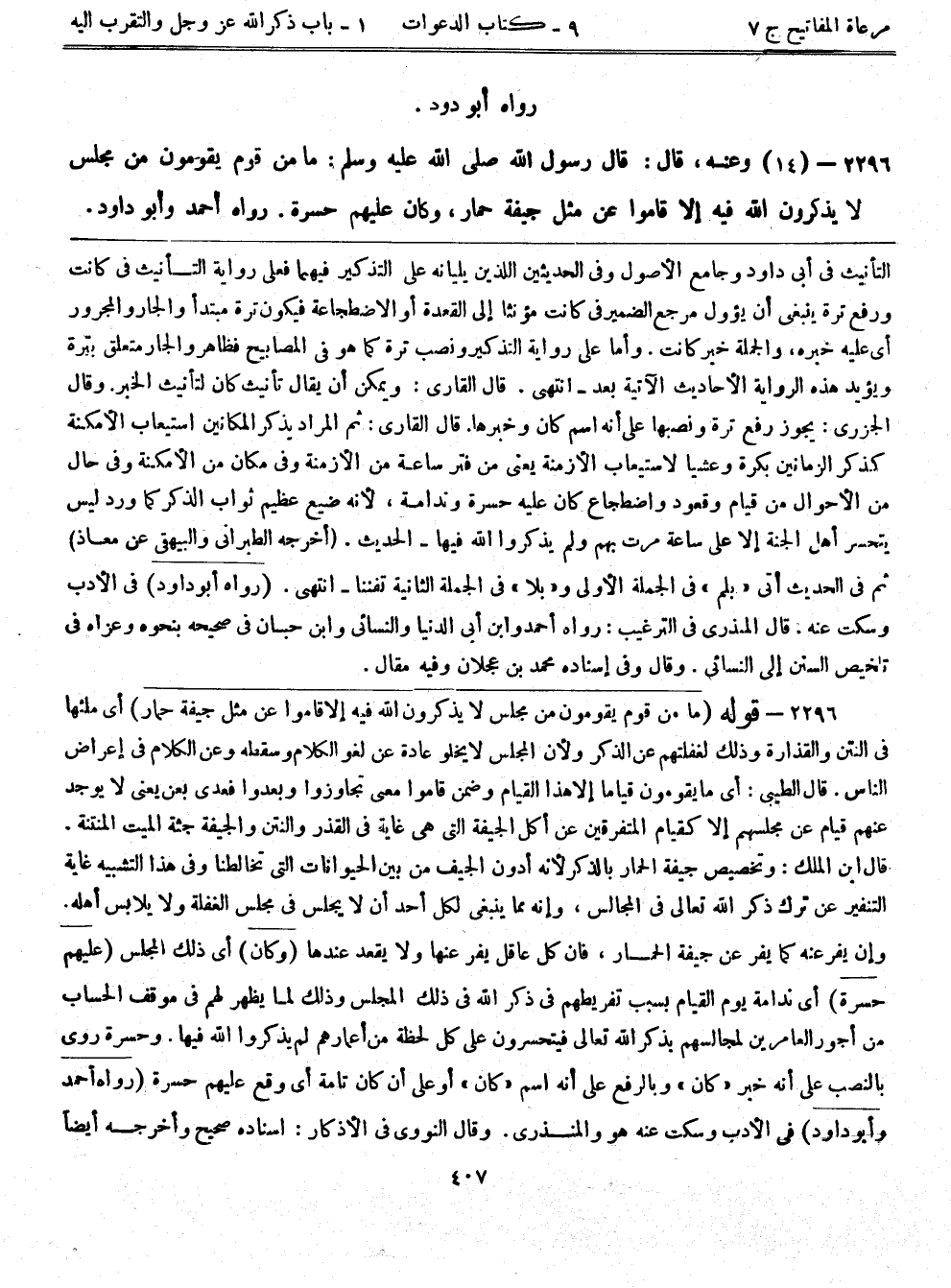 2296- قوله: (ما من قوم يقومون من مجلس لا يذكرون الله فيه إلا قاموا عن مثل جيفة حمار) أي ملئها في النتن والقذارة وذلك لغفلتهم عن الذكر ولأن المجلس لا يخلو عادة عن لغو الكلام وسقطه وعن الكلام في إعراض الناس. قال الطيبي: أي ما يقومون قياما إلا هذا القيام وضمن قاموا معي تجاوزوا وبعدوا فعدي بعن يعني لا يوجد عنهم قيام عن مجلسهم إلا كقيام المتفرقين عن أكل الجيفة التي هي غاية في القذر والنتن والجيفة جثة الميت المنتنة. قال ابن الملك: وتخصيص جيفة الحمار بالذكر لأنه أدون الجيف من بين الحيوانات التي تخالطنا وفي هذا التشبيه غاية التنفير عن ترك ذكر الله تعالى في المجالس، وإنه مما ينبغي لكل أحد أن لا يجلس في مجلس الغفلة ولا يلابس أهله. وإن يفر عنه كما يفر عن جيفة الحمار، فإن كل عاقل يفر عنها ولا يقعد عندها (وكان) أي ذلك المجلس (عليهم حسرة) أي ندامة يوم القيامة بسبب تفريطهم في ذكر الله في ذلك المجلس وذلك لما يظهر لهم في موقف الحساب من أجور العامرين لمجالسهم بذكر الله تعالى فيتحسرون على كل لحظة من أعمارهم لم يذكروا الله فيها. وحسرة روى بالنصب على أنه خبر "كان" وبالرفع على أنه اسم "كان" أو على أن كان تامة أي وقع عليهم حسرة (رواه أحمد وأبوداود) في الأدب وسكت عنه هو والمنذري. وقال النووي في الأذكار: إسناده صحيح وأخرجه أيضاً