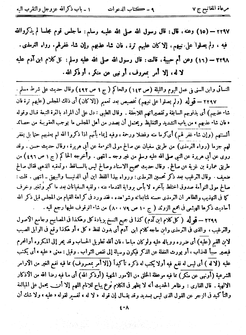 2298- قوله: (كل كلام ابن آدم) كذا في جميع النسخ بزيادة كل وهكذا في المصابيح وجامع الأصول والترغيب، والذي في الترمذي وابن ماجه كلام ابن آدم أي بدون لفظ "كل" أو هكذا وقع في الوابل الصيب لابن القيم (عليه) أي ضرره ووباله عليه ولو كان مباحًا، فإن أقله تطويل الحساب وقد يجر إلى المكروه أو المحرم فيصير سبباً للعذاب، أو يورث الغفلة عن الذكر فيكون وسيلة إلى نقص الثواب. وقيل: معنى "عليه" أي يكتب عليه (لا له) أي ليس له نفع فيه أولا يكتب له ذكره تأكيداً (إلا أمر بمعروف) مما فيه نفع الغير من الأوامر الشرعية (أو نهي عن منكر) مما فيه موعظة الخلق من الأمور المنهية (أو ذكر الله) أي ما فيه رضا الله من الأذكار الإلهية. قال القاري: وظاهر الحديث أنه لا يظهر في الكلام نوع يباح للأنام اللهم إلا أن يحمل على المبالغة والتأكيد في الزجر عن القول الذي ليس بسديد وقد يقال إن قوله "لا له" تفسير لقوله "عليه" ولا شك أن