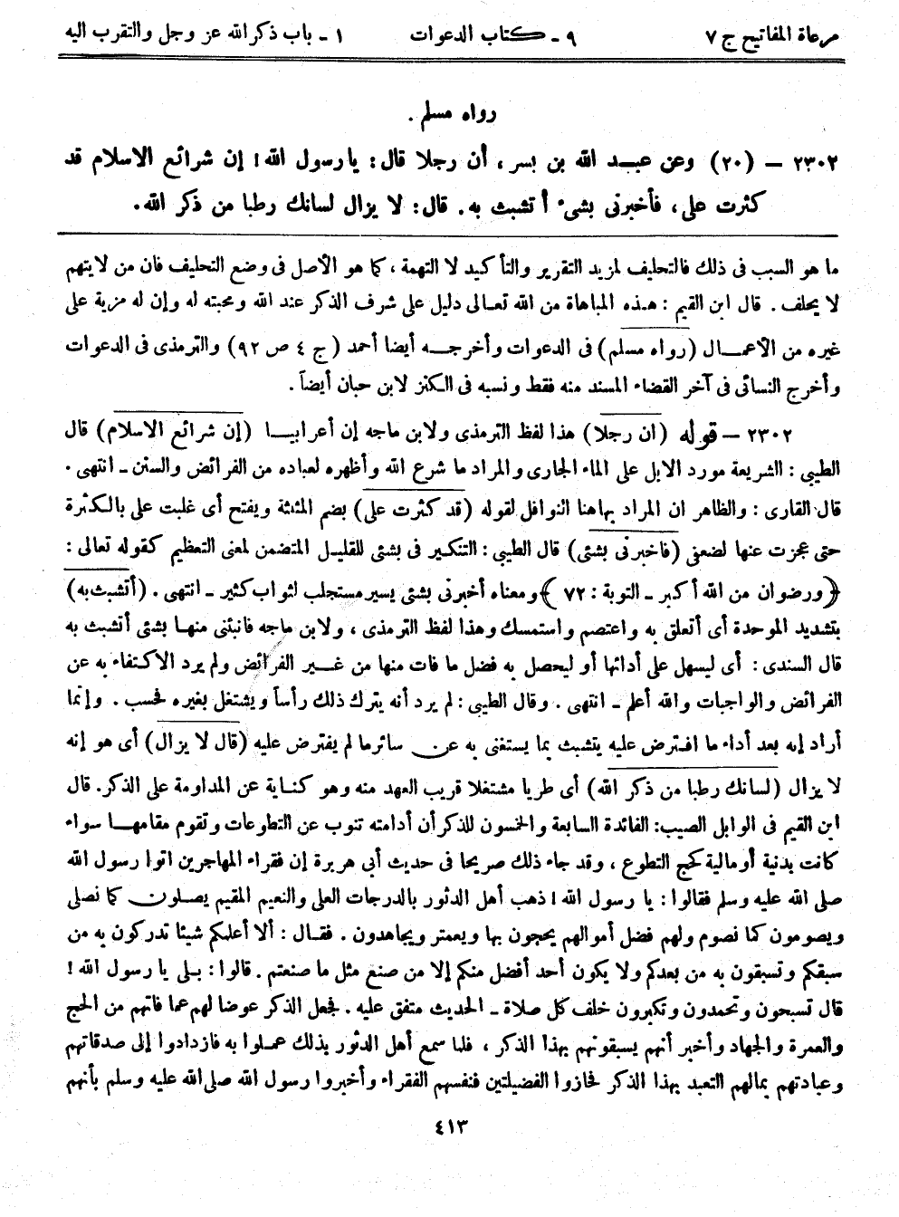 2302- (20) وعن عبد الله بن بسر، أن رجلاً قال: ((يا رسول الله! إن شرائع الإسلام قد كثرت علي، فأخبرني بشي أتشبث به. قال: لا يزال لسانك رطباً من ذكر الله)) .