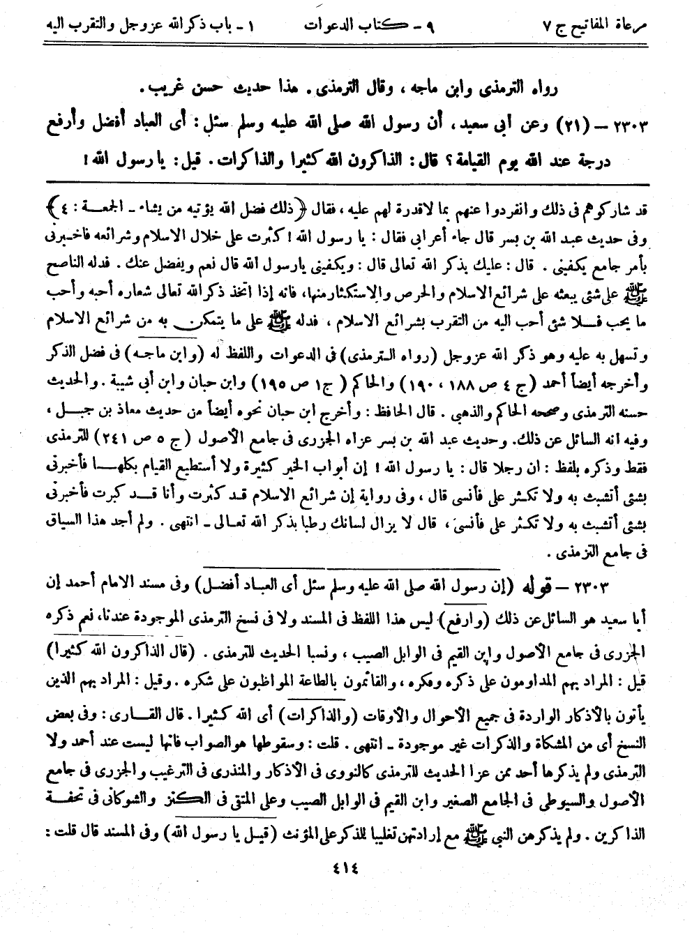 2303- قوله: (إن رسول الله صلى الله عليه وسلم سأل أي العباد أفضل) وفي مسند الإمام أحمد إن أبا سعيد هو السائل عن ذلك (وأرفع) ليس هذا اللفظ في المسند ولا في نسخ الترمذي الموجودة عندنا، نعم ذكره الجزري في جامع الأصول وابن القيم في الوابل الصيب، ونسباً الحديث للترمذي. (قال الذاكرون الله كثيراً) قيل: المراد بهم المداومون على ذكره ومكره، والقائمون بالطاعة المواظبون على شكره. وقيل: المراد بهم الذين يأتون بالأذكار الواردة في جميع الأحوال والأوقات (والذاكرات) أي الله كثيراً. قال القاري: وفي بعض النسخ أي من المشكاة والذاكرات غير موجودة – انتهى. قلت: وسقوطها هو الصواب فإنها ليست عند أحمد ولا الترمذي ولم يذكرها أحد ممن عزا الحديث للترمذي كالنووي في الأذكار والمنذري في الترغيب والجزري في جامع الأصول والسيوطي في الجامع الصغير وابن القيم في الوابل الصيب وعلي المتقي في الكنز والشوكاني في تحفة الذاكرين. ولم يذكرهن النبي - صلى الله عليه وسلم - مع إرادتهن تغليباً للمذكر على المؤنث (قيل يا رسول الله) وفي المسند قال قلت: ...