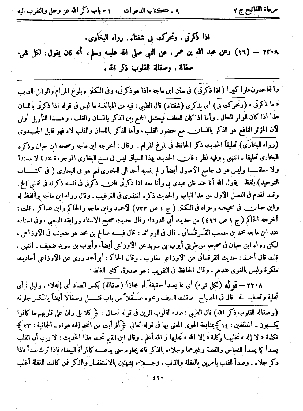 2308- (26) وعن عبد الله بن عمر، عن النبي صلى الله عليه وسلم، أنه كان يقول: ((لكل شيء صقالة، وصقالة القلوب ذكر الله،