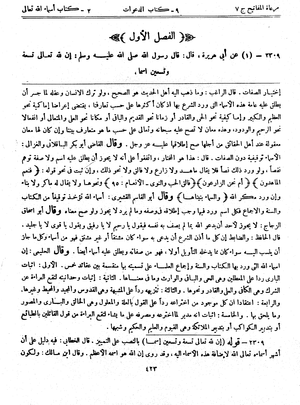 2309- (1) عن أبي هريرة، قال: قال رسول الله صلى الله عليه وسلم: ((إن لله تعالى تسعة وتسعين اسماً،