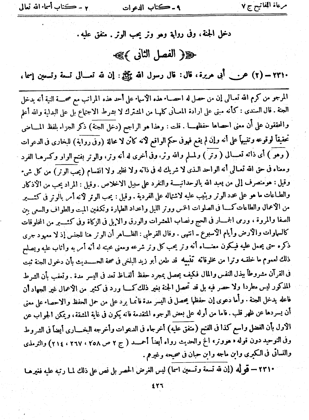 2310- (2) عن أبي هريرة، قال: قال رسول الله صلى الله عليه وسلم: ((إن لله تعالى تسعة وتسعين اسماً،