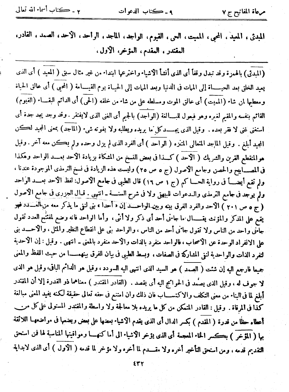 (المبديء) بالهمزة وقد تبدل وقفاً أي الذي أنشأ الأشياء واخترعها ابتداء من غير مثال سبق (المعيد) أي الذي يعيد الخلق بعد الحياة إلى الممات في الدنيا وبعد الممات إلى الحياة يوم القيامة (المحي) أي خالق الحياة ومعطيها لمن شاء (المميت) أي خالق الموت ومسلطه على من شاء من خلقه (الحي) أي الدائم البقاء (القيوم) القائم بنفسه والمقيم لغيره وهو فيعول للمبالغة (الواجد) بالجيم أي الغني الذي لا يفتقر. وقد وجد يجد جدة أي استغنى غنى لا فقر بعده. وقيل الذي يجد كل ما يريده ويطلبه ولا يفوته شيء (الماجد) بمعنى المجيد لكن المجيد أبلغ. وقيل الماجد المتعالي المتنزه (الواحد) أي الفرد الذي لم يزل وحده ولم يكن معه آخر. وقيل هو المنقطع القرين والشريك (الأحد) كذا في بعض النسخ من المشكاة بزيادة الأحد بعد الواحد وهكذا في المصابيح والحصن وجامع الأصول (ج5ص25) وليست هذه الزيادة في نسخ الترمذي الموجودة عندنا، ولم تقع أيضاً في رواية الحاكم (ج1ص16) قال الطيبي في جامع الأصول: لفظ الأحد بعد الواحد ولم يوجد في جامع الترمذي والدعوات للبيهقي ولا في شرح السنة – انتهى. قال الجزري في جامع الأصول (ج5ص201) الأحد والفرد الفرق بينه وبين الواحد إن "أحدا" بنى لنفي ما يذكر معه من العدد فهو يقع على المذكر والمؤنث يقال ما جاءني أحد أي ذكر ولا أنثى، وأما الواحد فإنه وضع لمفتتح العدد تقول جاءني واحد من الناس ولا تقول جاءني أحد من الناس، والواحد بنى على انقطاع النظير والمثل، والأحد بنى على الإنفراد الوحدة عن الأصحاب، فالواحد منفرد بالذات والأحد منفرد بالمعنى _ انتهى. وقيل: إن الأحدية لتفرد الذات والواحدية لنفي المشاركة في الصفات، وبسط الطيبي في بيان الفرق بينهما من حيث اللفظ والمعنى جميعاً فارجع إليه إن شئت (الصمد) هو السيد الذي انتهى إليه السودد، وقيل هو الدائم الباقي، وقيل هو الذي لا جوف له، وقيل الذي يصمد في الحوائج إليه أي يقصد. (القادر المقتدر) معناهما ذو القدرة إلا أن المقتدر أبلغ لما في البناء من معنى التكلف والاكتساب فإن ذلك وإن امتنع في حقه تعالى حقيقة لكنه يفيد المعنى مبالغة كذا في المرقاة. وقيل: القادر المتمكن من كل ما يريده بلا معالجة ولا واسطة والمقتدر المستولى على كل من أعطاه حظاً من قدرة (المقدم) بكسر الدال أي الذي يقدم الأشياء بعضها على بعض ويضعها في مواضعها اللائقة بها (المؤخر) بكسر الخاء المعجمة أي الذي يؤخر الأشياء إلى أماكنها ومواقيتها المناسبة لها فمن استحق التقديم قدمه، ومن استحق التأخير أخره ولا مقدم لما أخره ولا مؤخر لما قدمه (الأول) أي الذي لا بداية